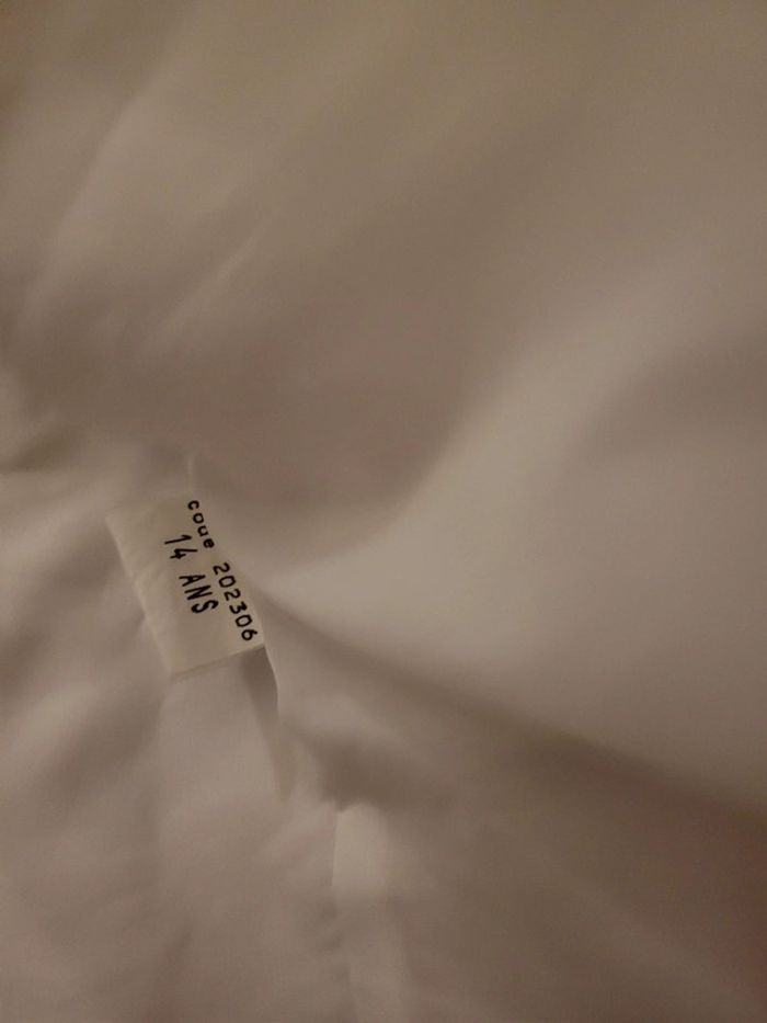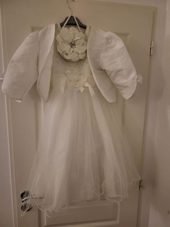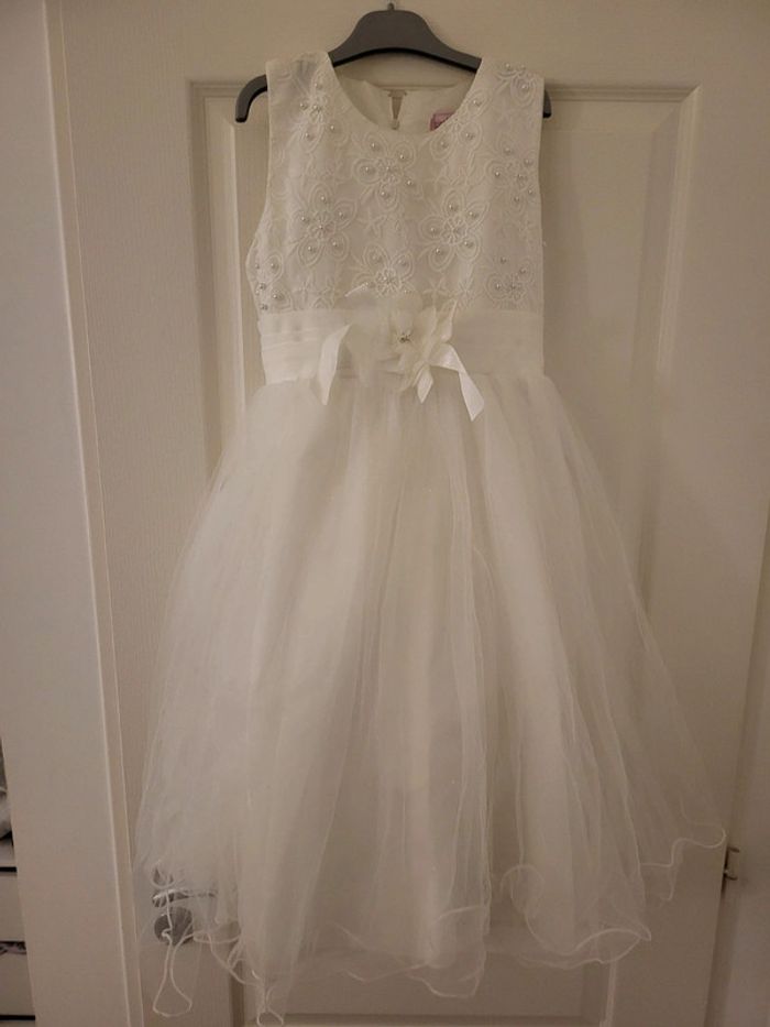 Lot cérémonie comprenant : - une robe ceremonie 10 ans : dentelle et perles sur le buste, bas en tissu type tulle, plusieurs épaisseurs - un gilet / bolero effet satiné blanc (marqué 14 ans mais taille petit, parfait pour 10 ans, cf photo 2 où il est porté) - un joli petit sac à main fleur avec anse en perles - un serre-tête avec tulle et perles Bon état Tenue idéale pour toute occasion : mariage, baptême, communion, fête, soirée, etc.