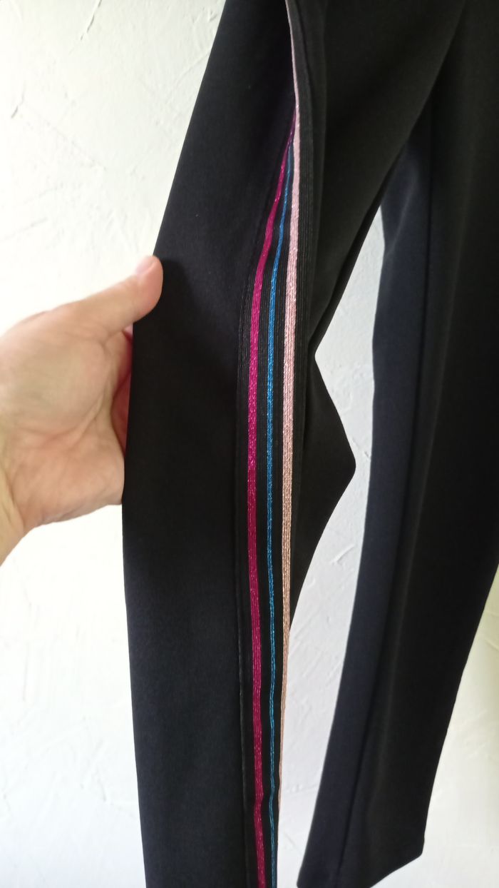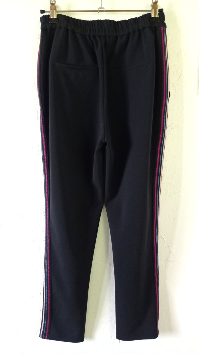 Joli pantalon noir, matière assez épaisse mais fluide, avec des liserés brillants sur les côtés. Taille élastique, 2 poches à l'avant et 2 fausses poches à l'arrière. Il n'y a plus d'étiquette de taille mais correspond à un 36 ou pour une ado en 16ans. Très bon état, 32 cm à plat à la taille sans étirer (35 en étirant sans exagérer ), longueur à partir de l'entrejambe : 67cm. #frip_femme36 #frip_fille16ans