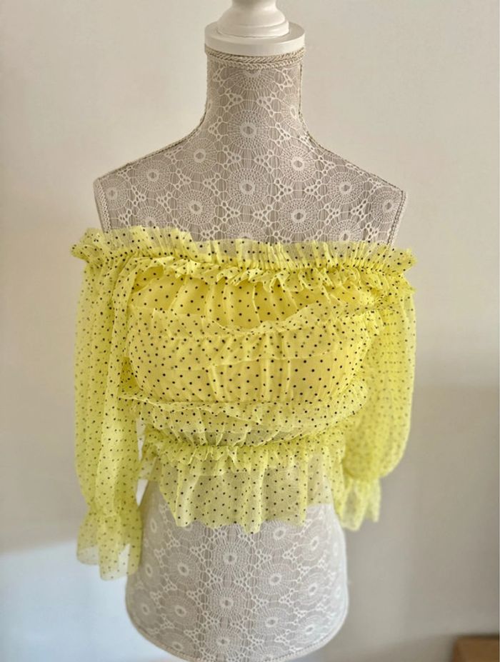 Blouse tulle volants jaune pale à pois noir Bershka 36 S - photo numéro 1