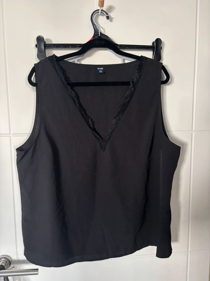 Blouse légère de couleur noire sans manches. Col V en dentelle. Neuve, jamais portée. Taille 46/48 - Largeur d’aisselle à aisselle : 60 cm. - Longueur : 66 cm.