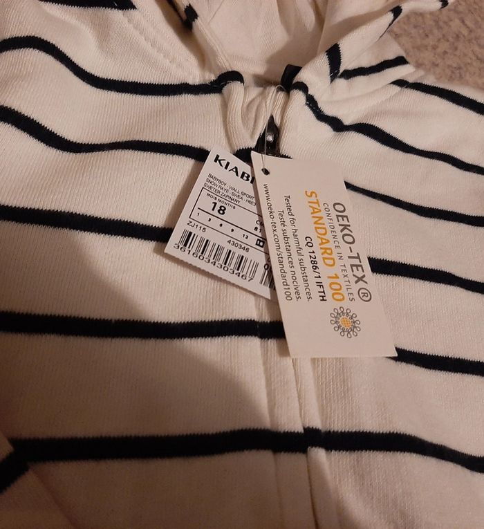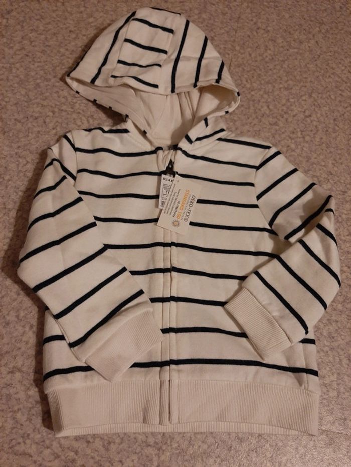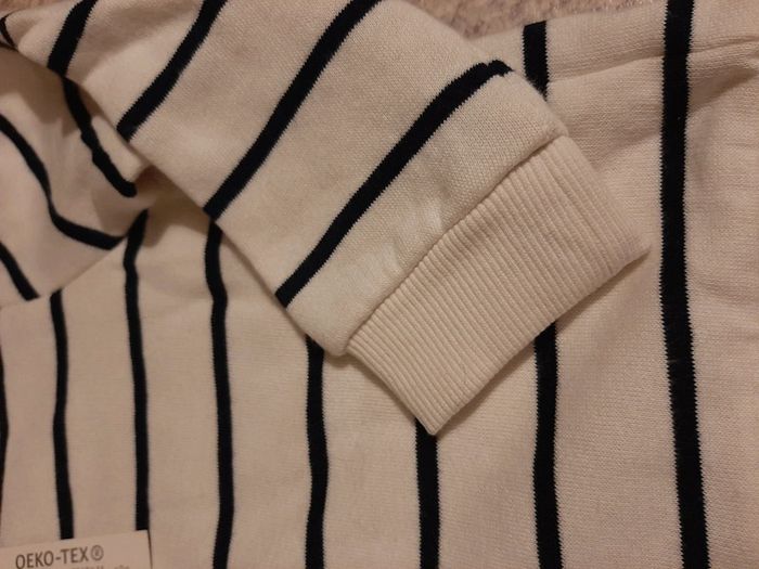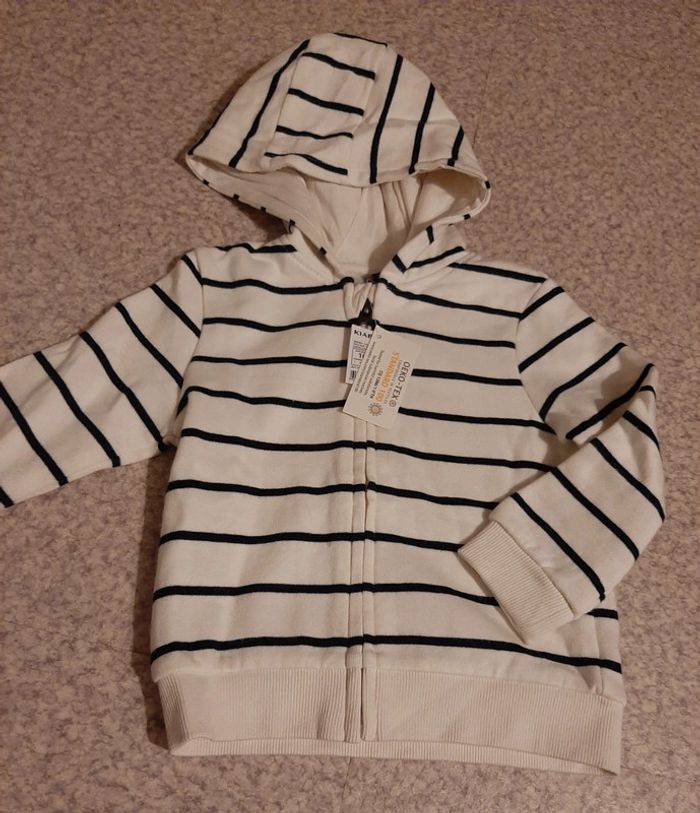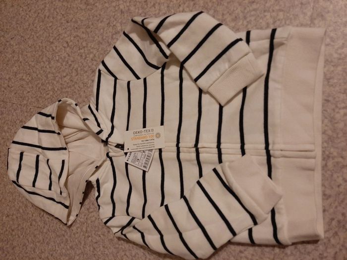 Sweat à capuche et zip à rayures, "marinière". Neuf avec étiquette 🏷. Mixte. Matière très douce. N'hésitez pas à aller faire un tour dans mon dressing de nombreux autres articles à vendre à des tout petits prix et prix dégressif sur les lots 🙂🌸je reste disponible pour toutes questions.