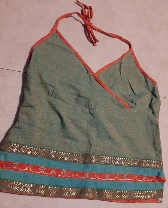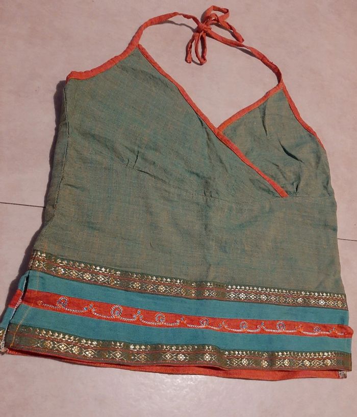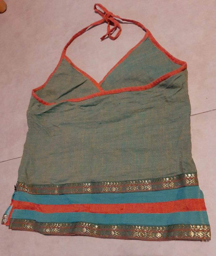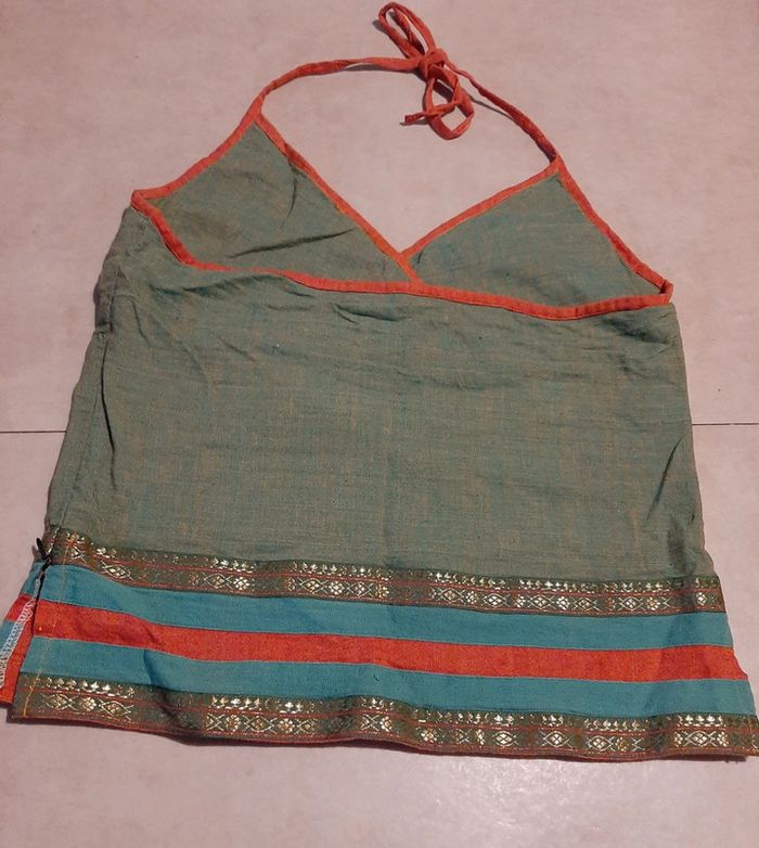 Magnifique top à bretelles à nouer, dos nu. Taille L. 100% coton. Fabriqué au Népal. Ethnique. Avec de belles dorures en bas du vêtement. N'hésitez pas à aller faire un tour dans mon dressing de nombreux autres articles à vendre à des tout petits prix et prix dégressif sur les lots 🙂🌸je reste disponible pour toutes questions.