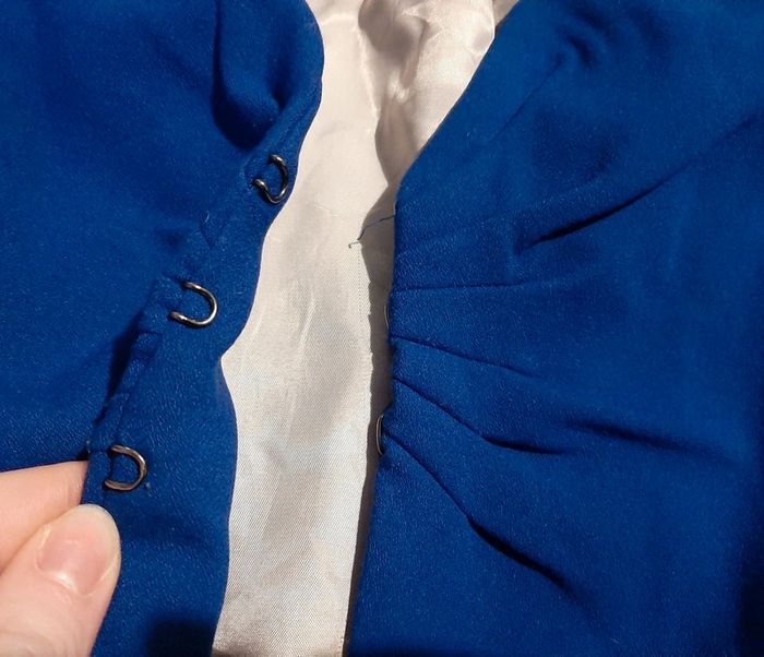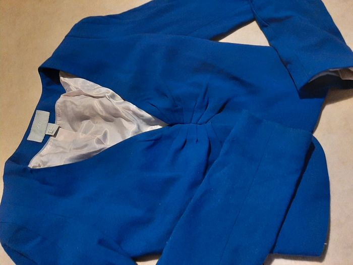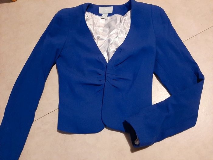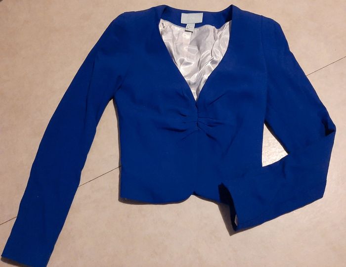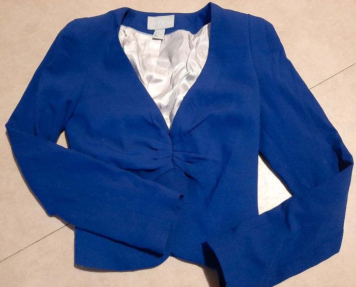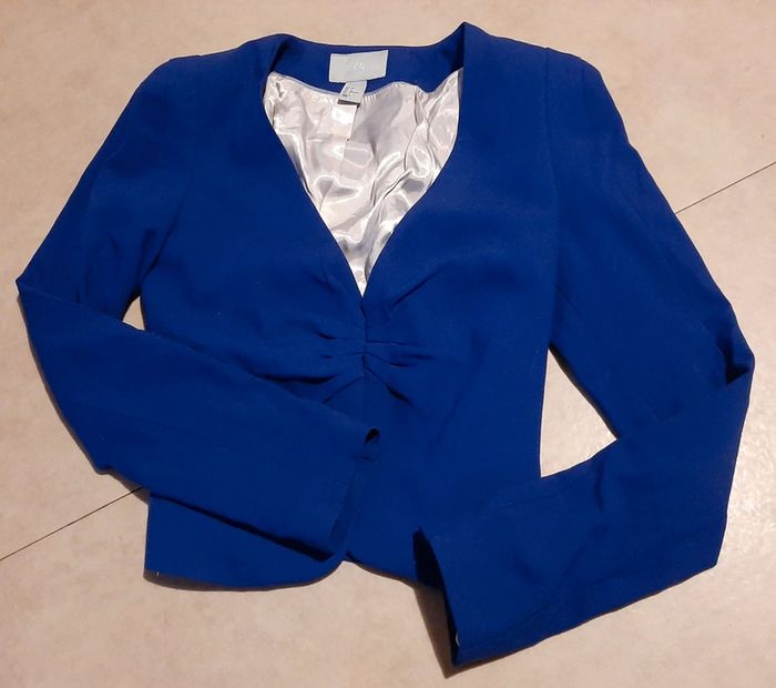Magnifique veste courte de costume, blazer, d'un très beau bleu. Idéal pour un rendu habillé. En excellent état. Se ferme à l'aide de petits crochets au niveau de la poitrine. N'hésitez pas à aller faire un tour dans mon dressing de nombreux autres articles à vendre à des tout petits prix et prix dégressif sur les lots 🙂🌸je reste disponible pour toutes questions.
