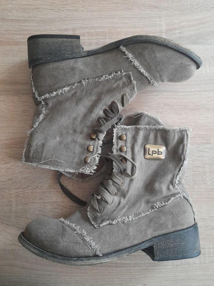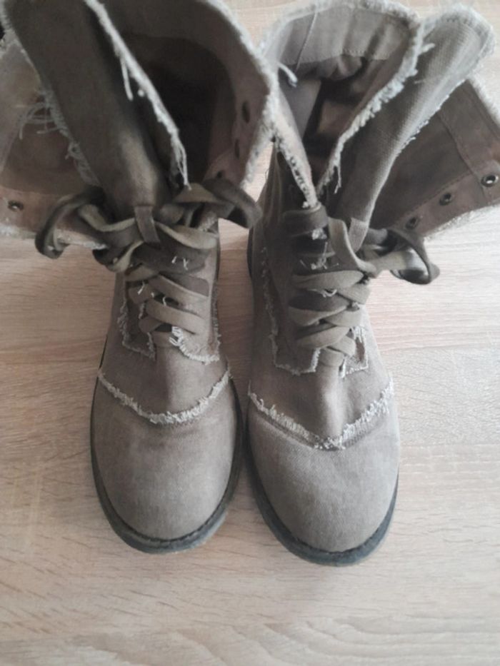 Bottines toile kaki clair avec deux lacets de couleur kaki différente,effet usées Petit talon Pointure 41 Très bon état #rachel62500chaussuresfemme41