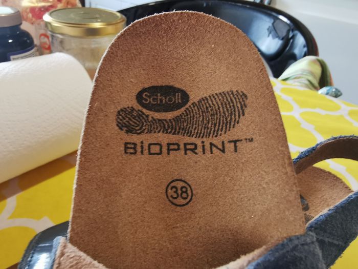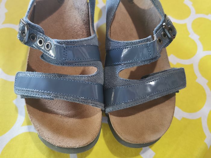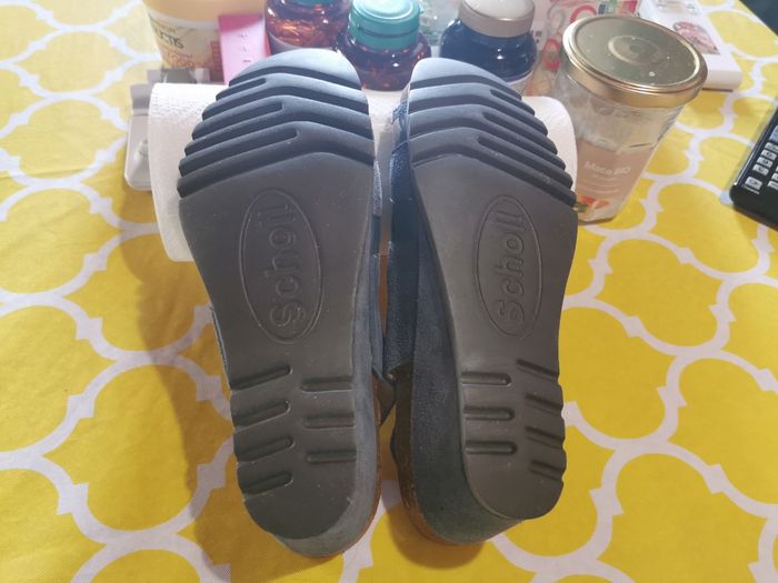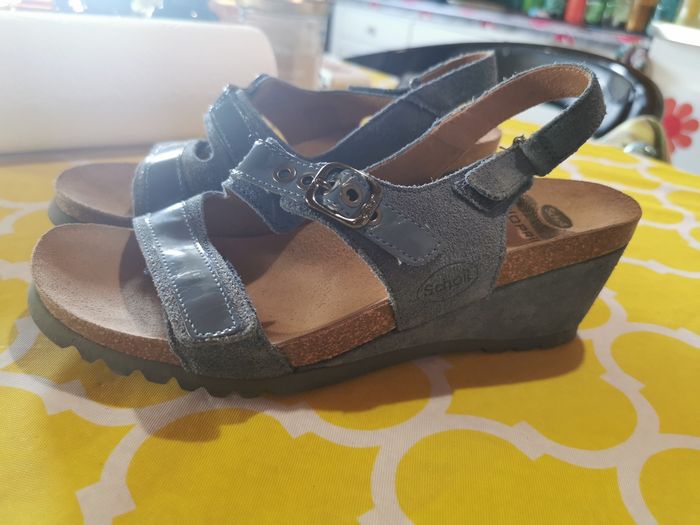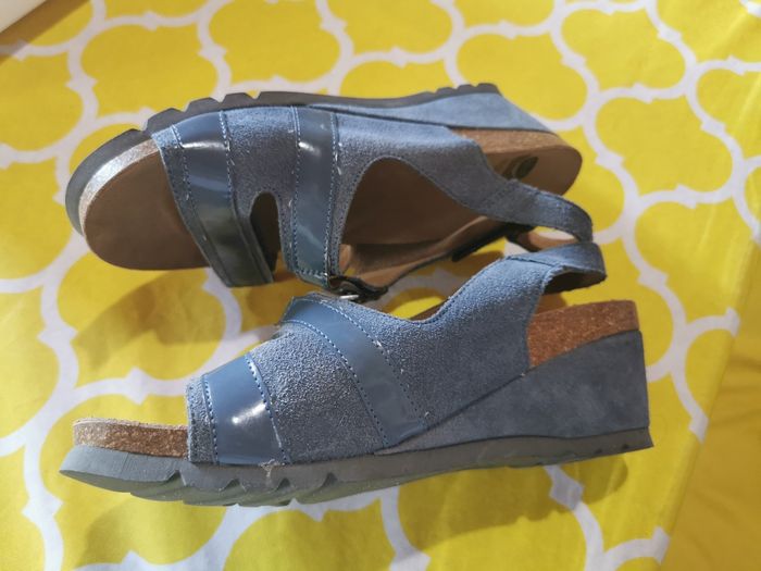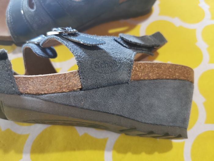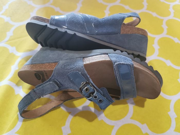 Sandales SCHOLL NEUVES, très confortables, talons compensés, 2 réglages par scratchs et un réglage par boucles à rivets. Tout cuir, semelles cuir bioprint. Matière vinyle bleu sur le dessus des sangles. Modèle original. Couleur bleu jean, pointure 38. *Juste essayées une seule fois une après-midi et en intérieur. Très légères en poids.