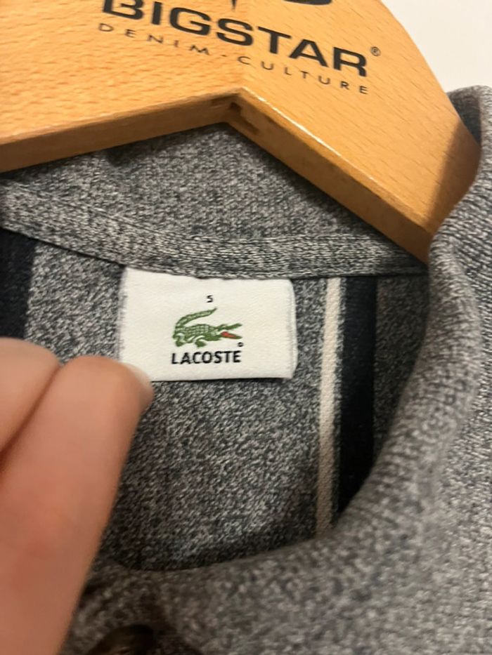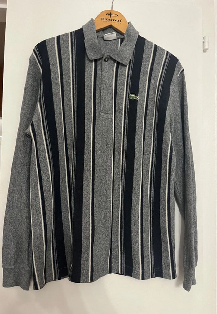 Polo manches longues Lacoste Taille 5 (correspond à du L) 100% coton Dimensions : -Hauteur : 70 cm -Largeur sous les aisselles : 51-52 cm -Longueur des manches jusqu’au col : 83 cm