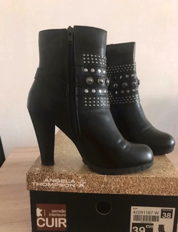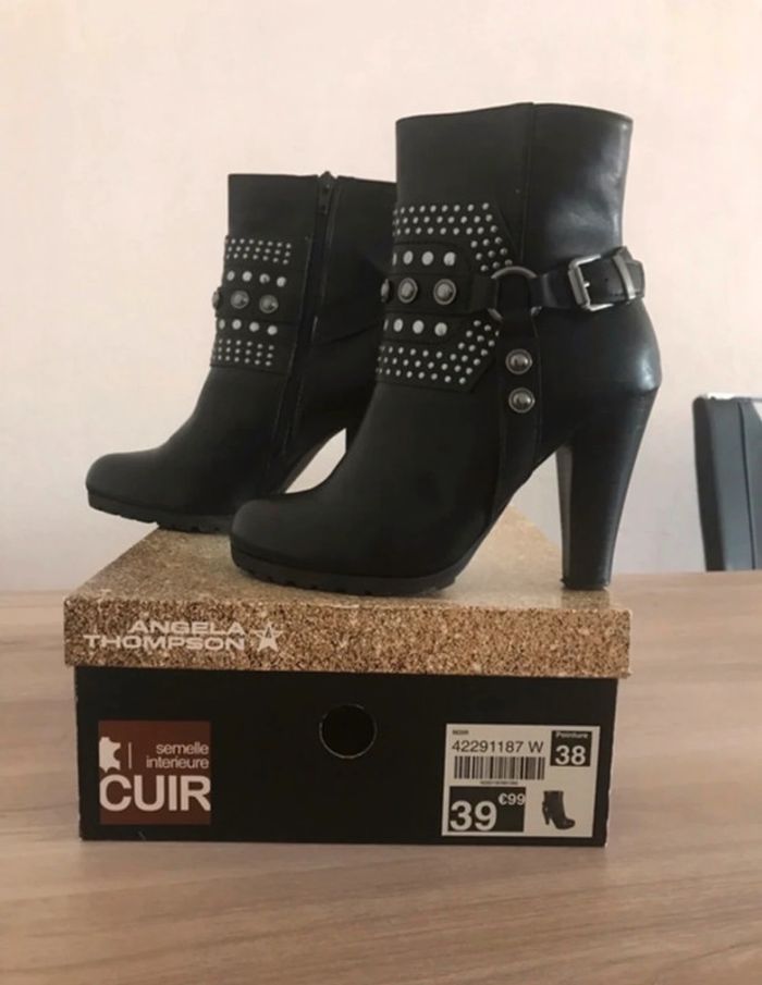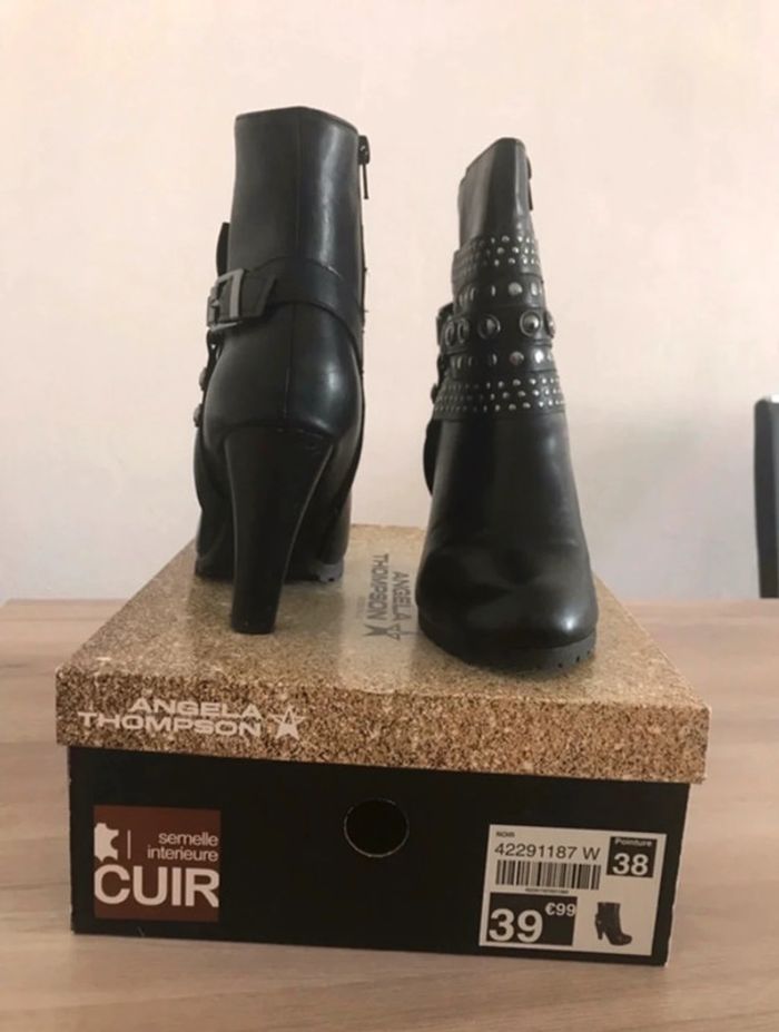 Bottines noires pointure 38 en bon état. Portées une dizaine de fois maximum. Semelle intérieure en cuir. Hauteur du talon: 10cm. Boîte à chaussures fournie avec. Achetées 39€99. Prix de vente: 10€. Si vous avez des questions, n’hésitez pas!