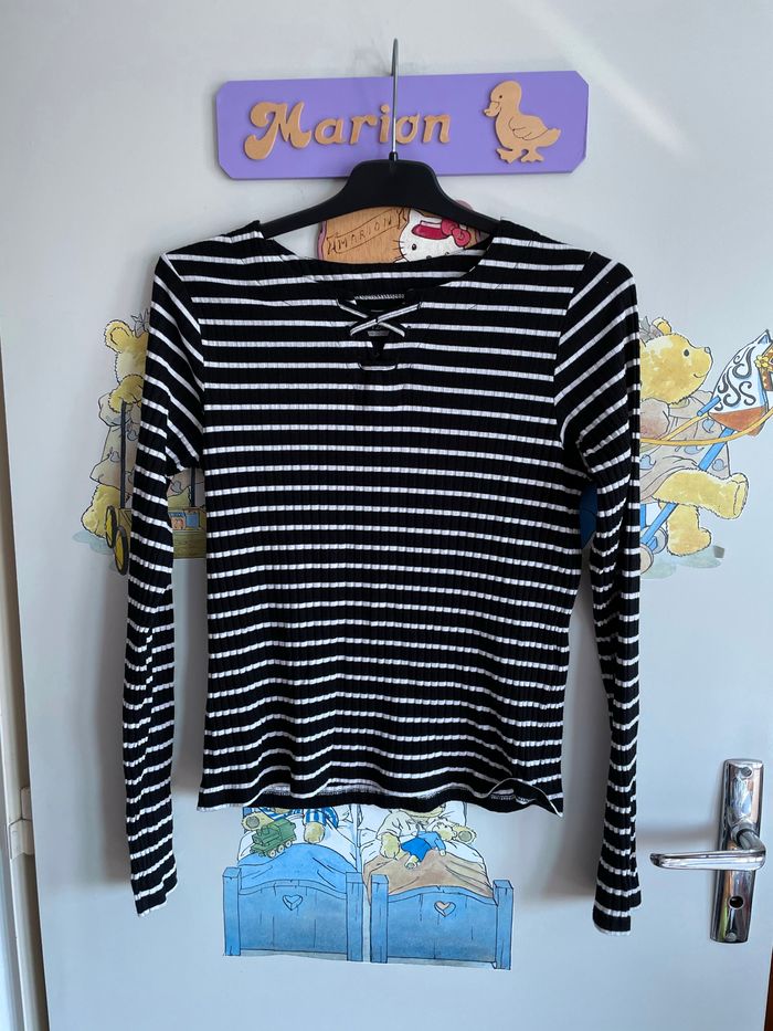 Tee shirt à rayures noires et blanches à manches longues, taille 12 ans, marque Kiabi.