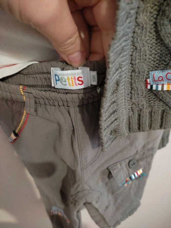 Ensemble de la Compagnie des petits taille 6 mois composé d'un pantalon taille élastique et entrejambe à pression et d'un gilet boutonné. Je rajoute le t-shirt qu'il faudra un petit peu détacher