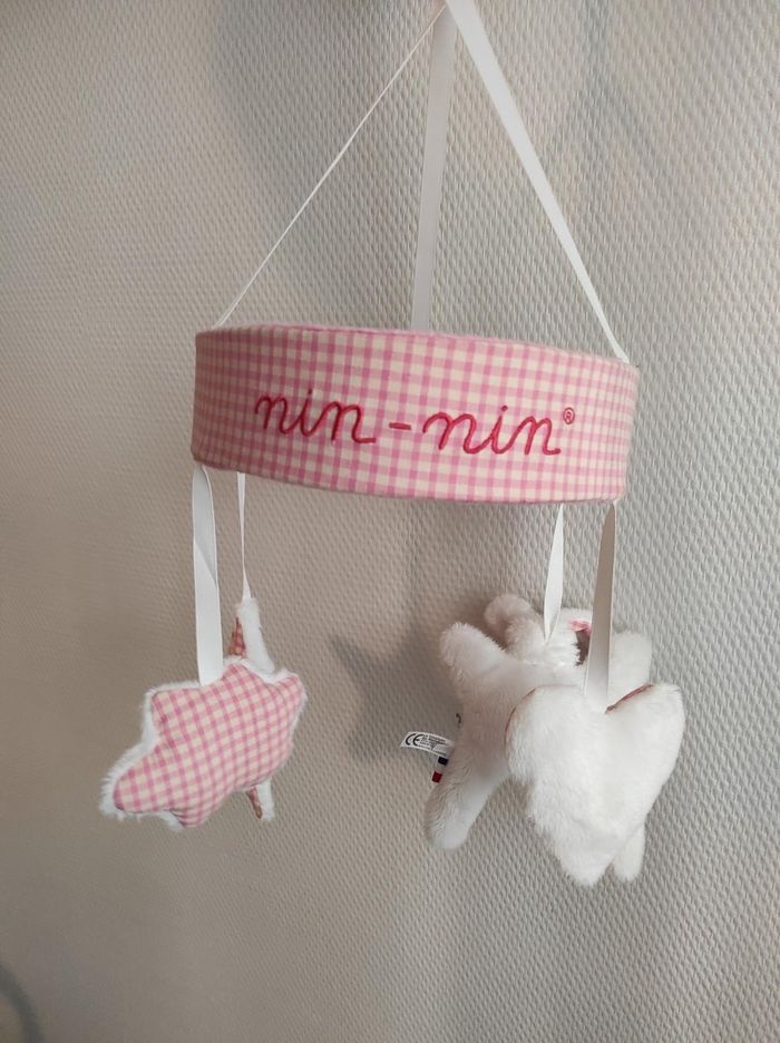 Mobile musical de la marque nin-nin. Stimule le regard de bébé et le berce avec sa mélodie de boîte à musique. Conçu, développé et fabriqué en France. État neuf, jamais servi Vendu avec sa boîte à musique rotative mais sans le bras de fixation.