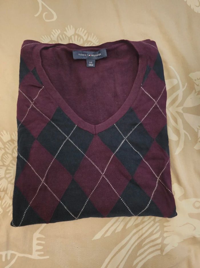 🌟 Pull col V violet motif jacard noir Tommy hilfiger homme - Taille  L 🌟