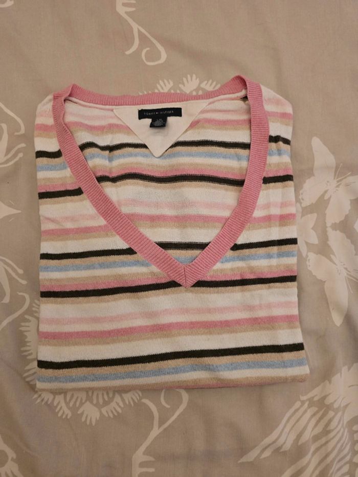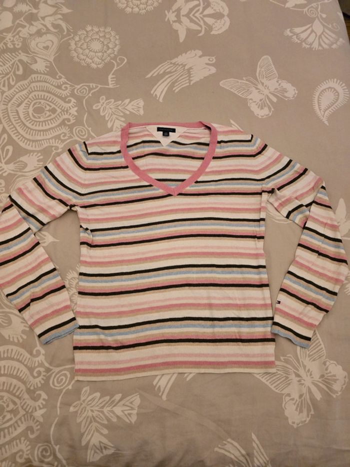 🌟 Pull col V rayé rose blanc bleu Tommy hilfiger femme - Taille  L 🌟 - photo numéro 1