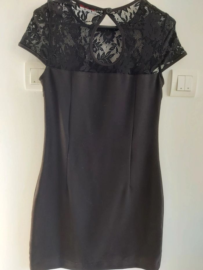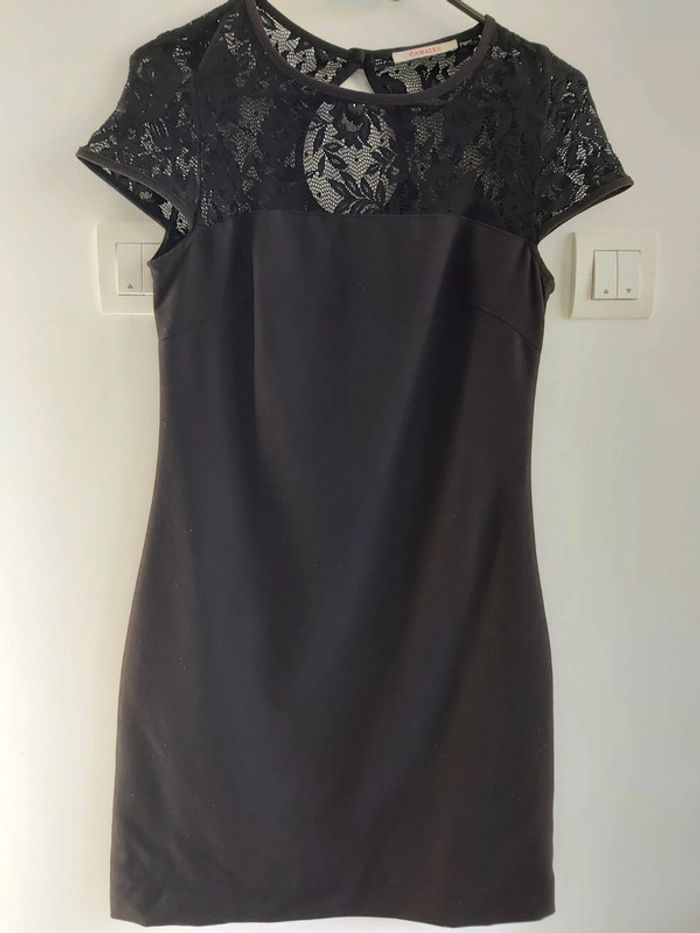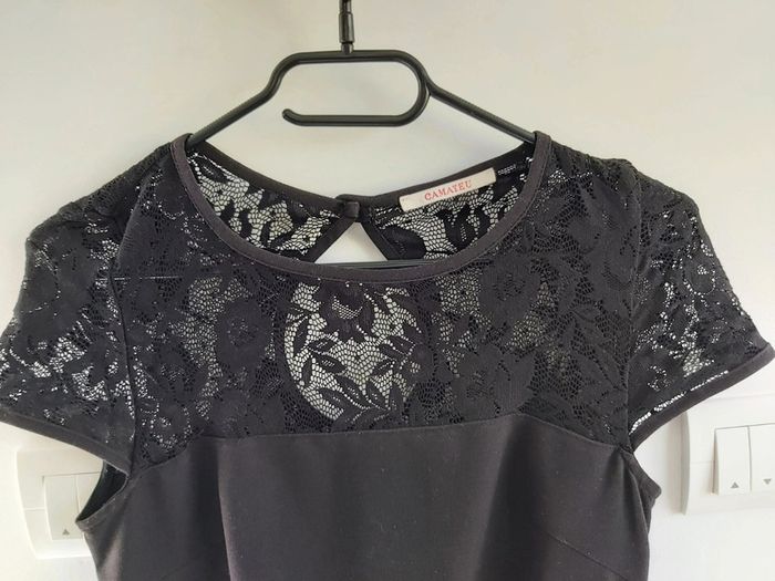 Jolie robe noire col rond avec dentelles partie supérieure du buste, marque Camaieu. Fermeture par fermeture éclair sur le côté et 1 bouton à l'arrière. Polyester, viscose et elasthanne. Taille 36. Très bon état.