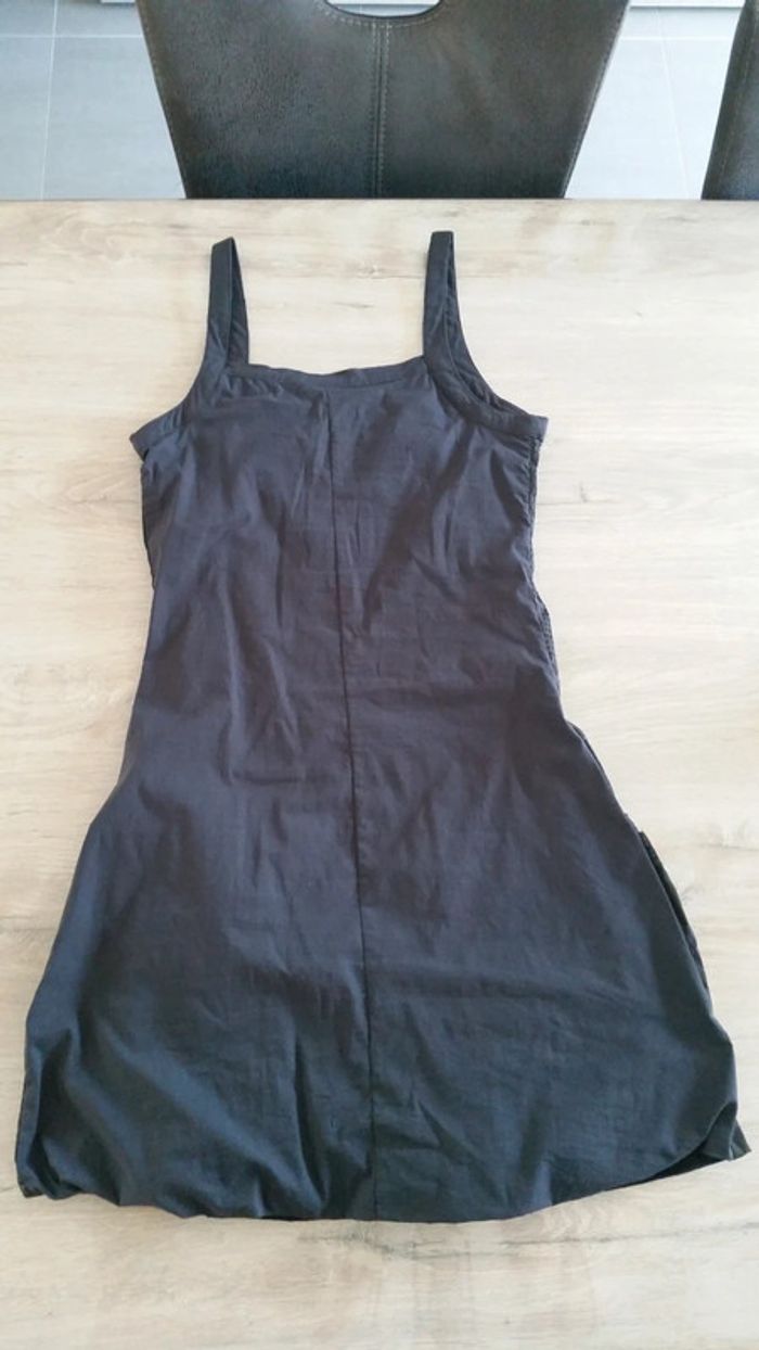 Robe à bretelles, bleue marine avec motifs, marque Cache Cache. Très bon état. Taille 38.