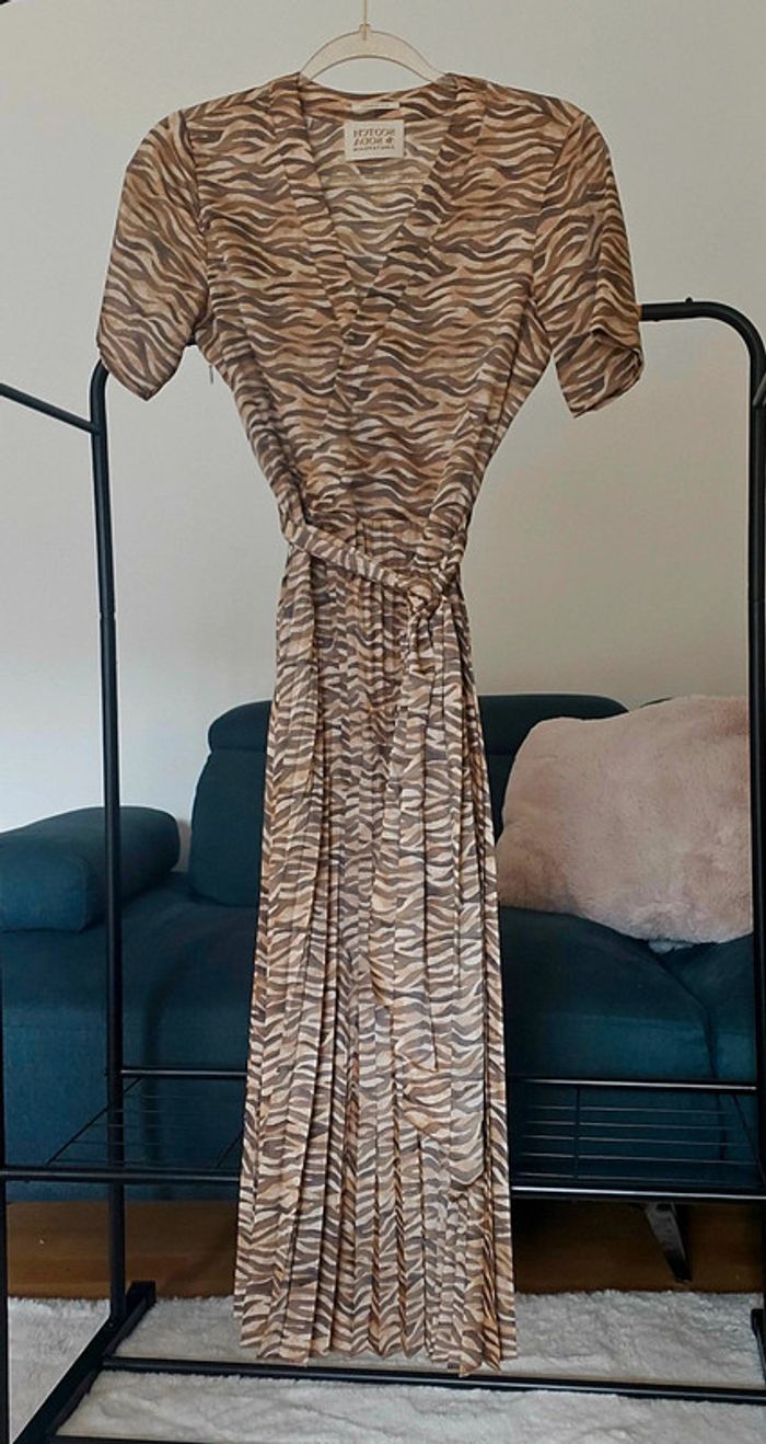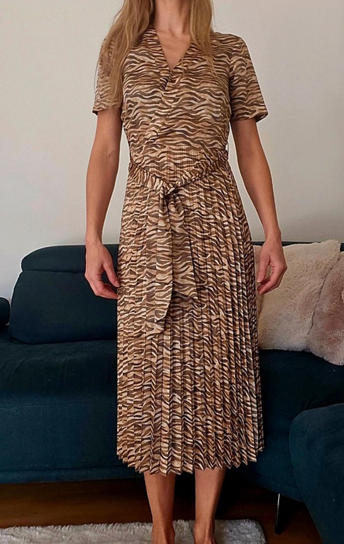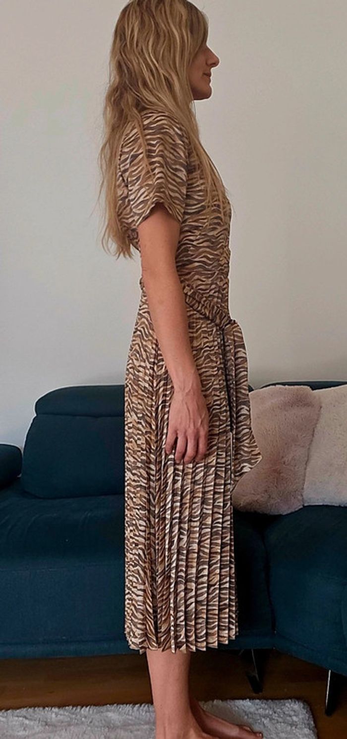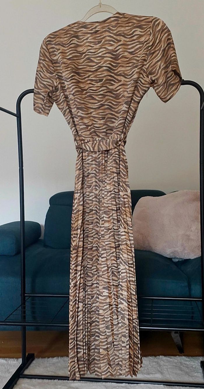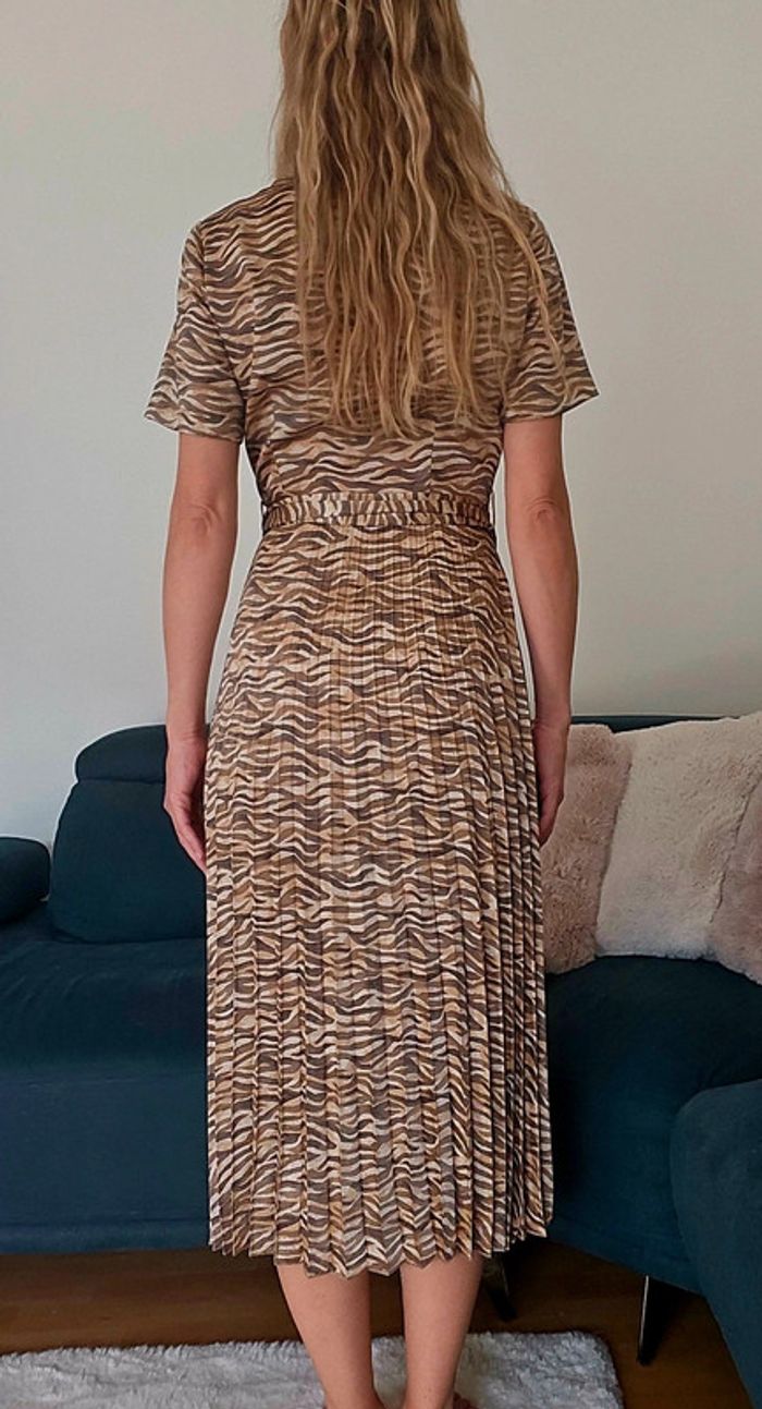 En état neuf, portée 2 fois. Tissu agréable et souple satinée. Plissée à partir de la taille. Robe d'été facile à porter tant en journée qu'en soirée. Le modèle fait 1.70 pour une taille 34.