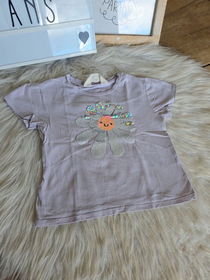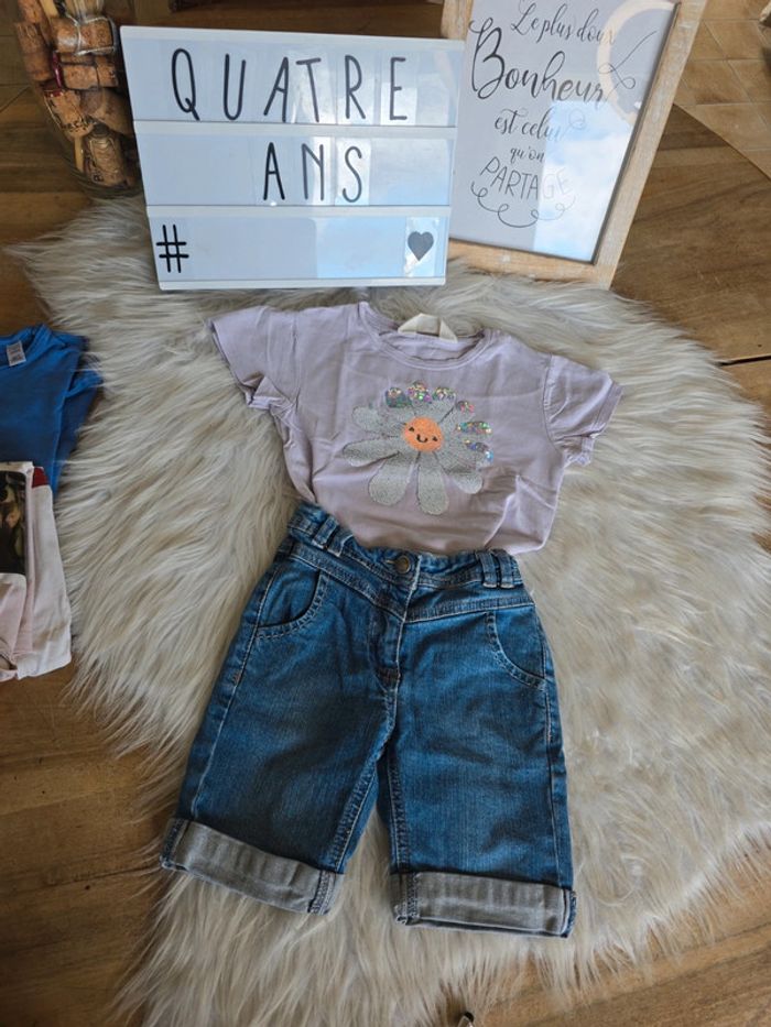 Ensemble t-shirt et short T-shirt mauve avec motif fleur à sequins Taille 4 ans Marque H&M Très bon état Short en jean long Réglable à la taille Taille 4 ans Marque vertbaudet Très bon état #4ansfillebaba18bb