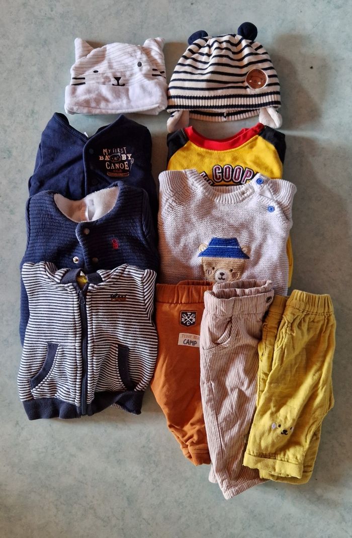 4 pulls 4 gilets 3 pantalons 2 bonnets. Multi marques :Orchestra sergent major sucre d'orge