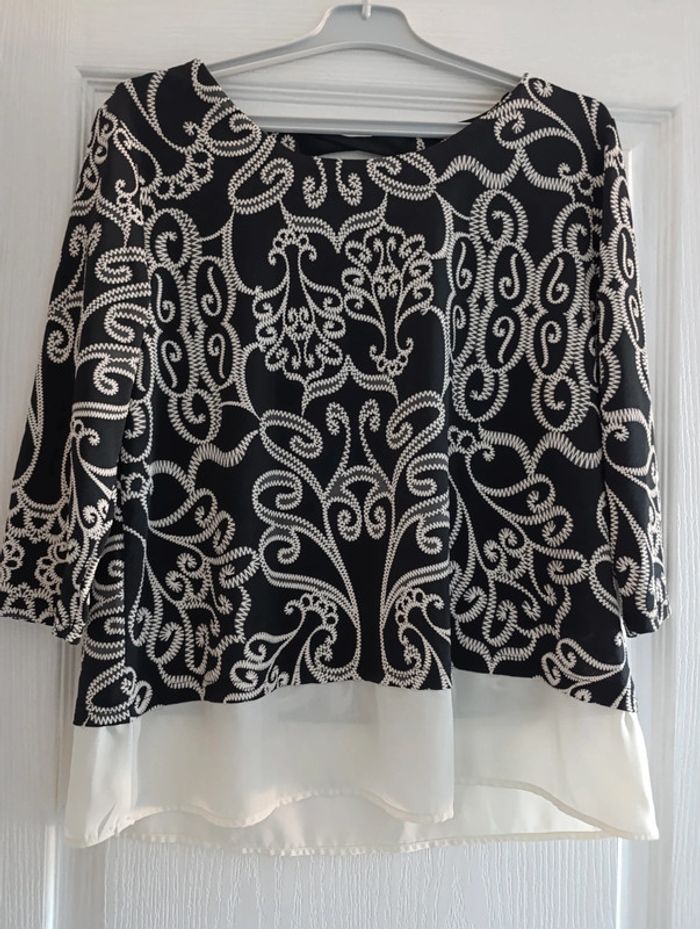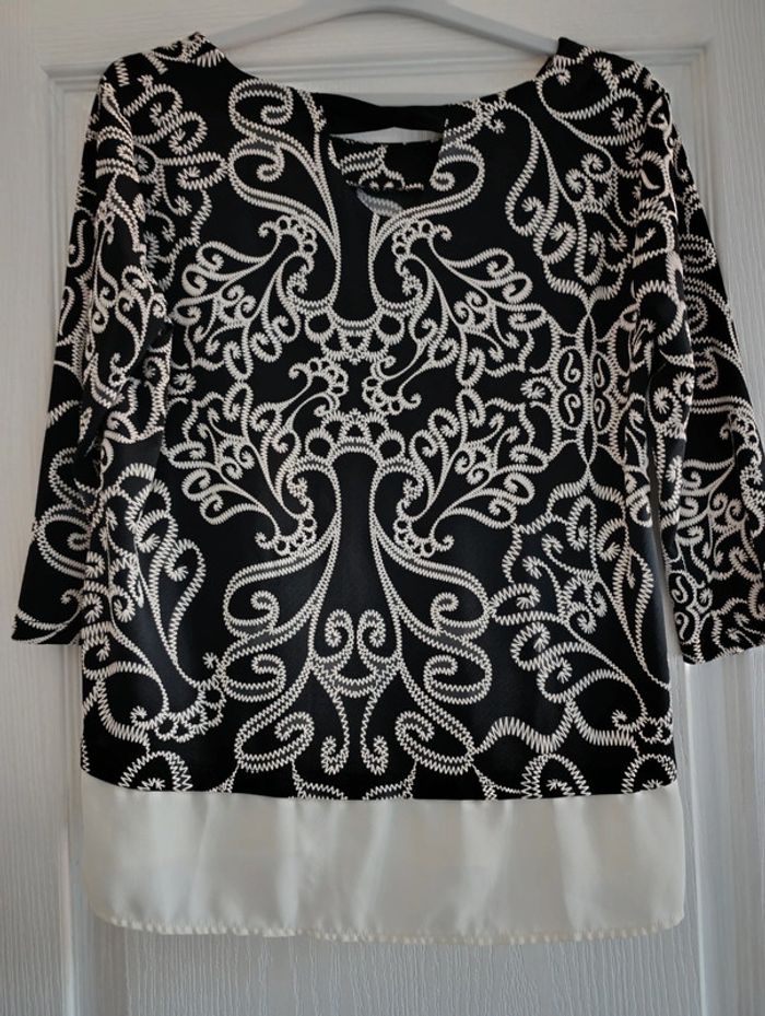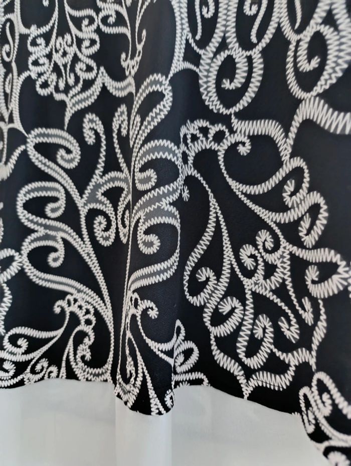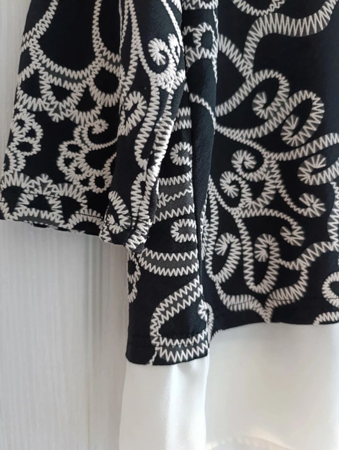 Tunique brodé manches 3/4 Taille 2 Noir brodé blanc Double matière Boutique indépendante Manches 28 cm Longueur 61 cm Aisselles 53 cm Épaules 44 Polyester et elasthanne