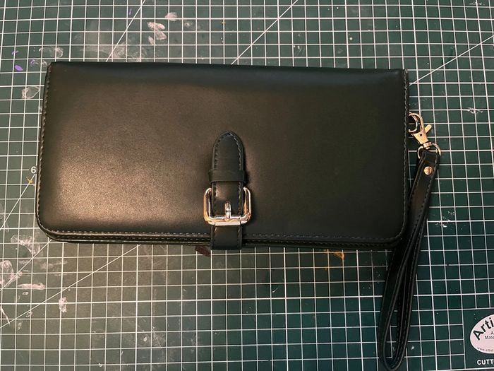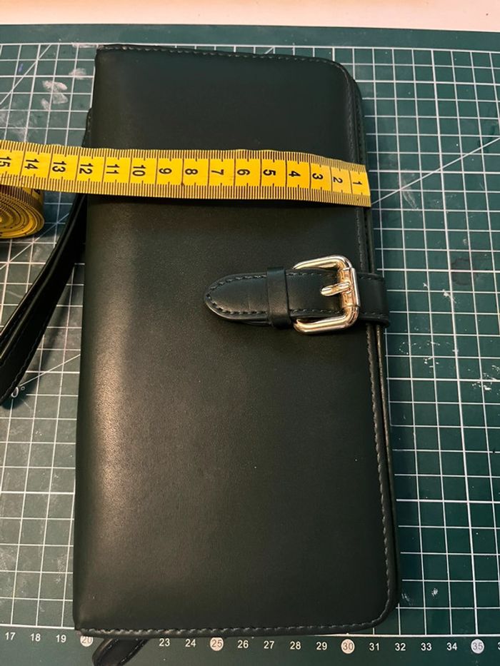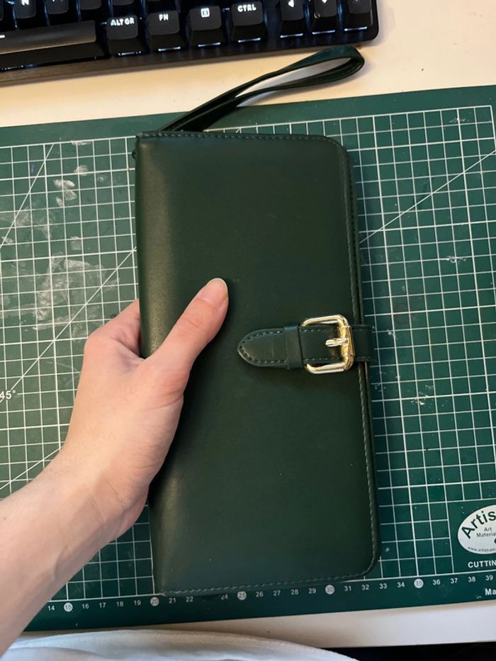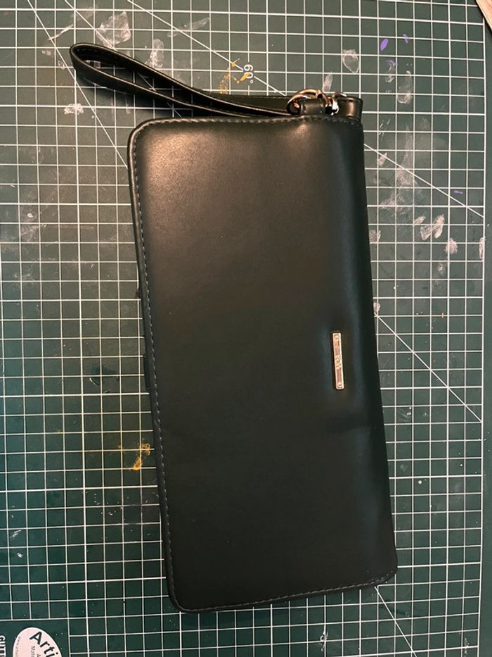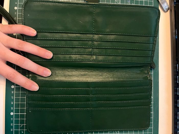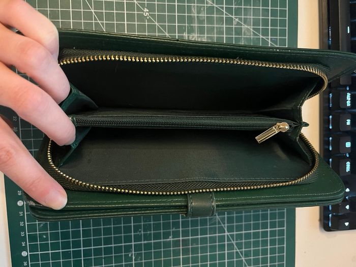 Portefeuille pochette , pour une soirée ou être légère Beaucoup de place pour des cartes + pochettes pour papiers Également Un compartiment avec fermeture éclair Il est d’un beau vert sombre Le métal est doré Parfait état parce que jamais utilisé , ancienne collection Moa