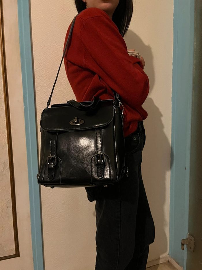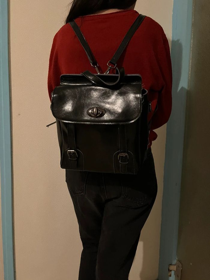 Sac à dos 2 en 1 qui peux se porter à l’épaule également en cuir noir 23 x 25 cm 11cm de profondeur Format carré , minimaliste, intemporel
