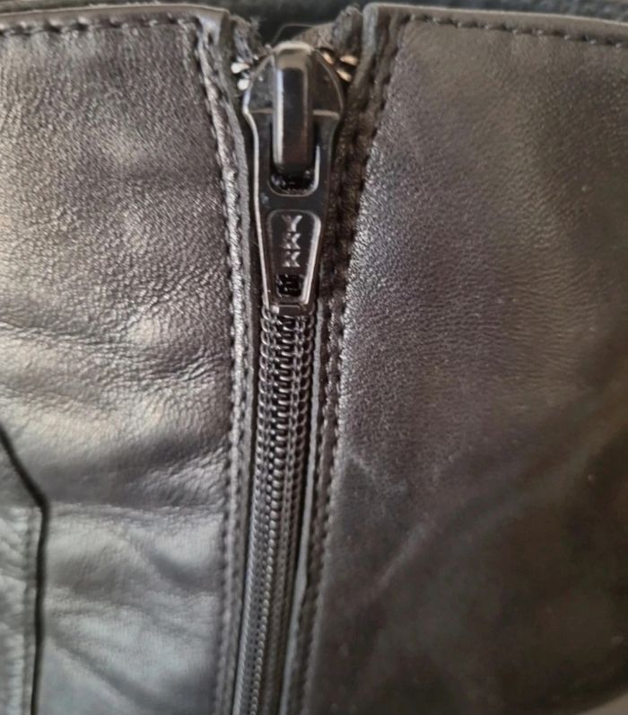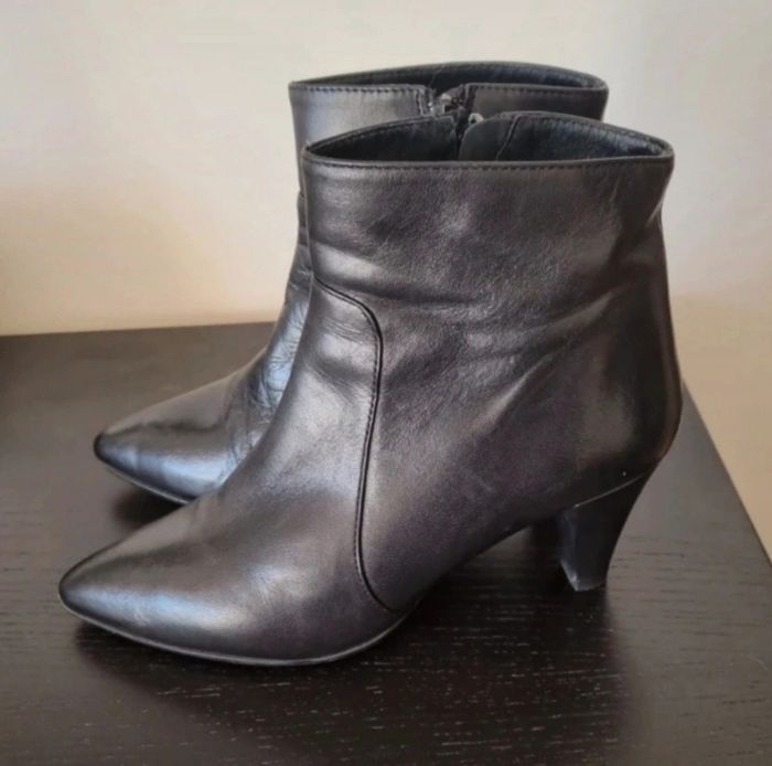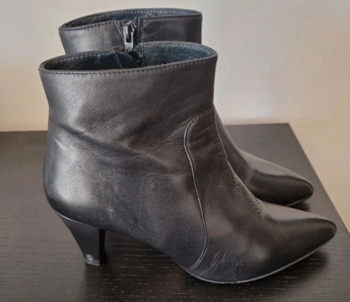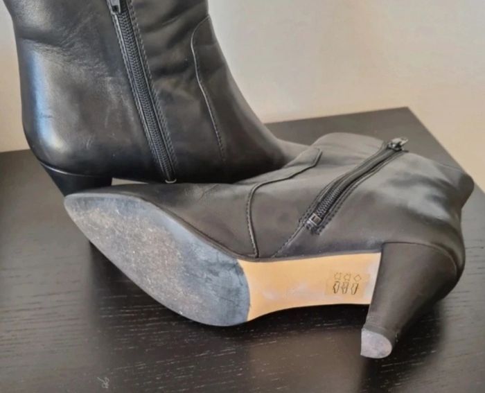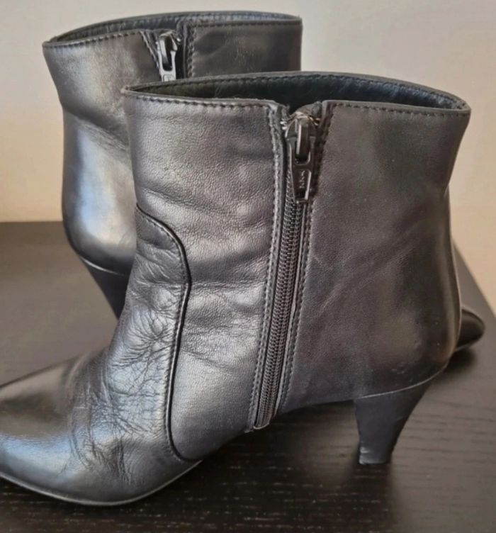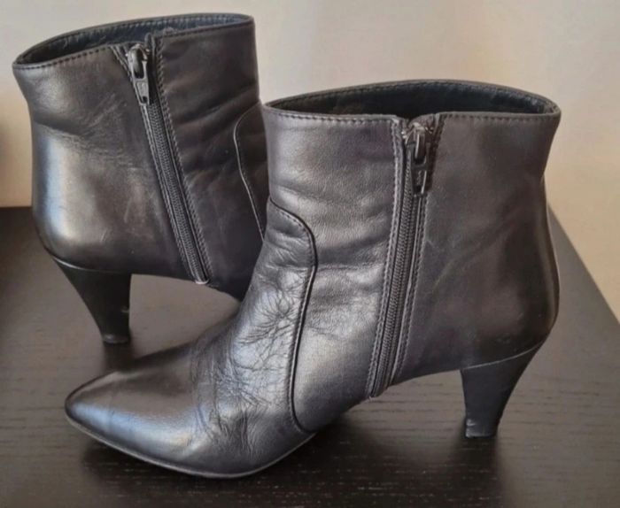 Bottines noires à talons fins avec fermeture éclair Talons: 7 cm Le talon droit est un peu abîmé par un coup et aussi sur le devant du gauche Il suffit de mettre du cirage noir 100% cuir Sans boîte Taille : 38,5 cm