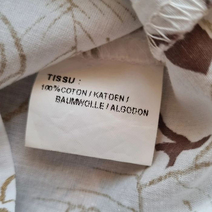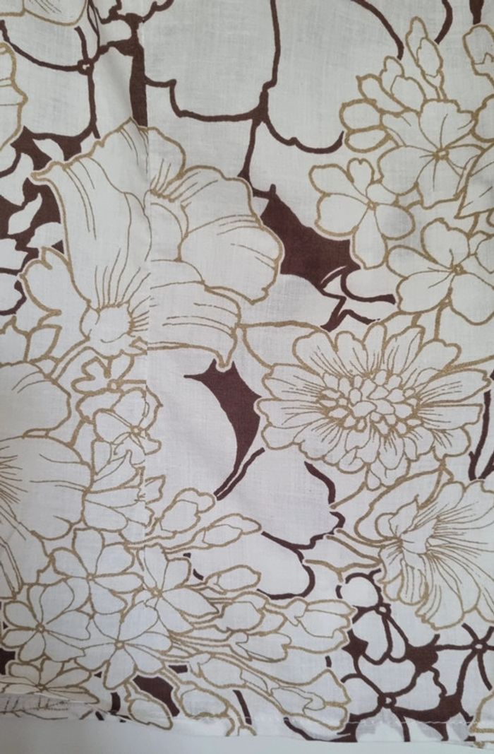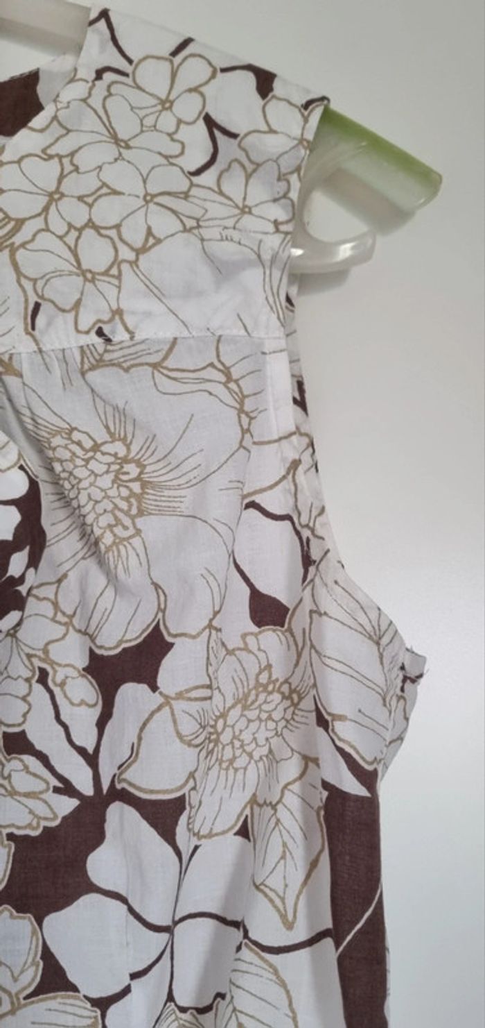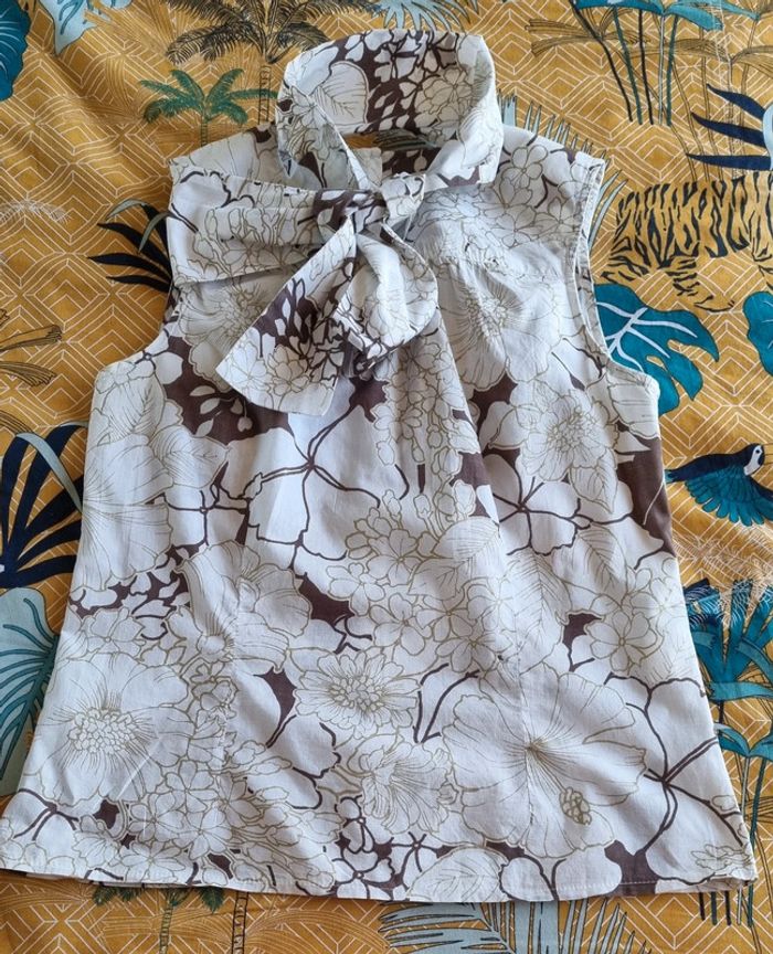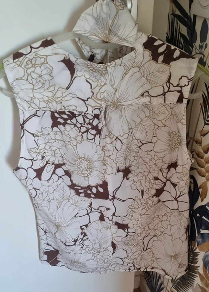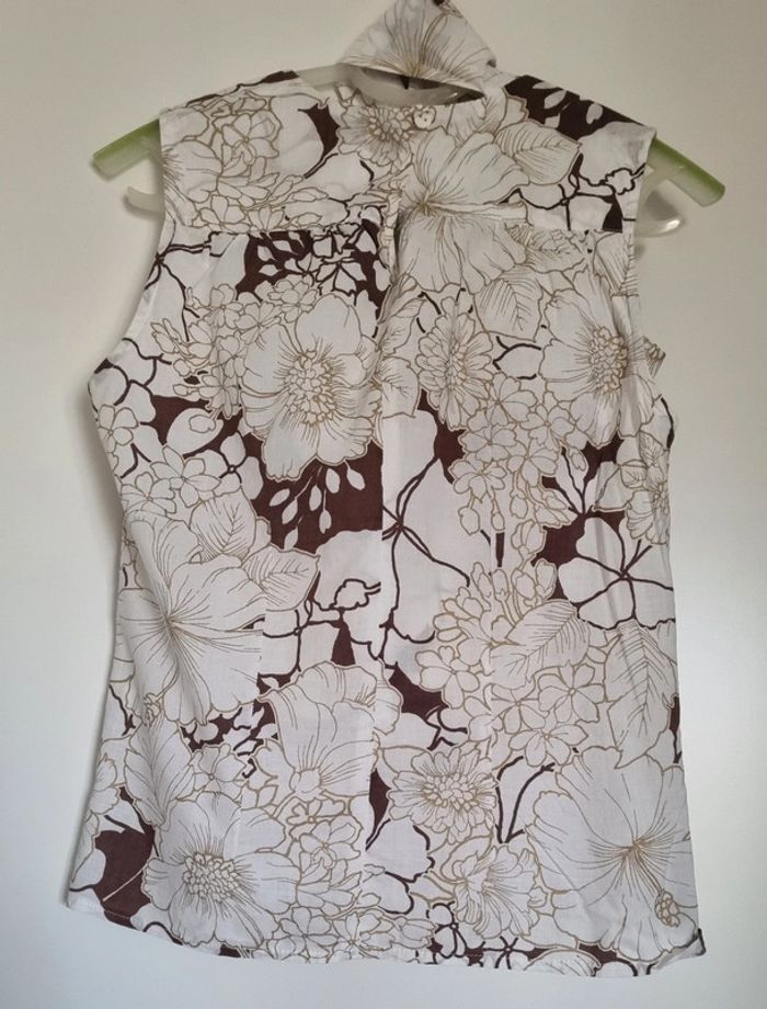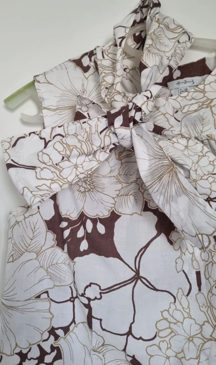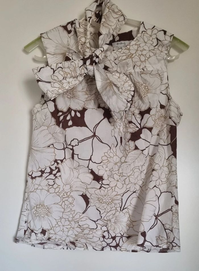 Blouse blanc et taupe à motif fleuris Partie du col à nouer sur le devant Sans manches Bouton d'attache au dos Taille 38 100% Coton