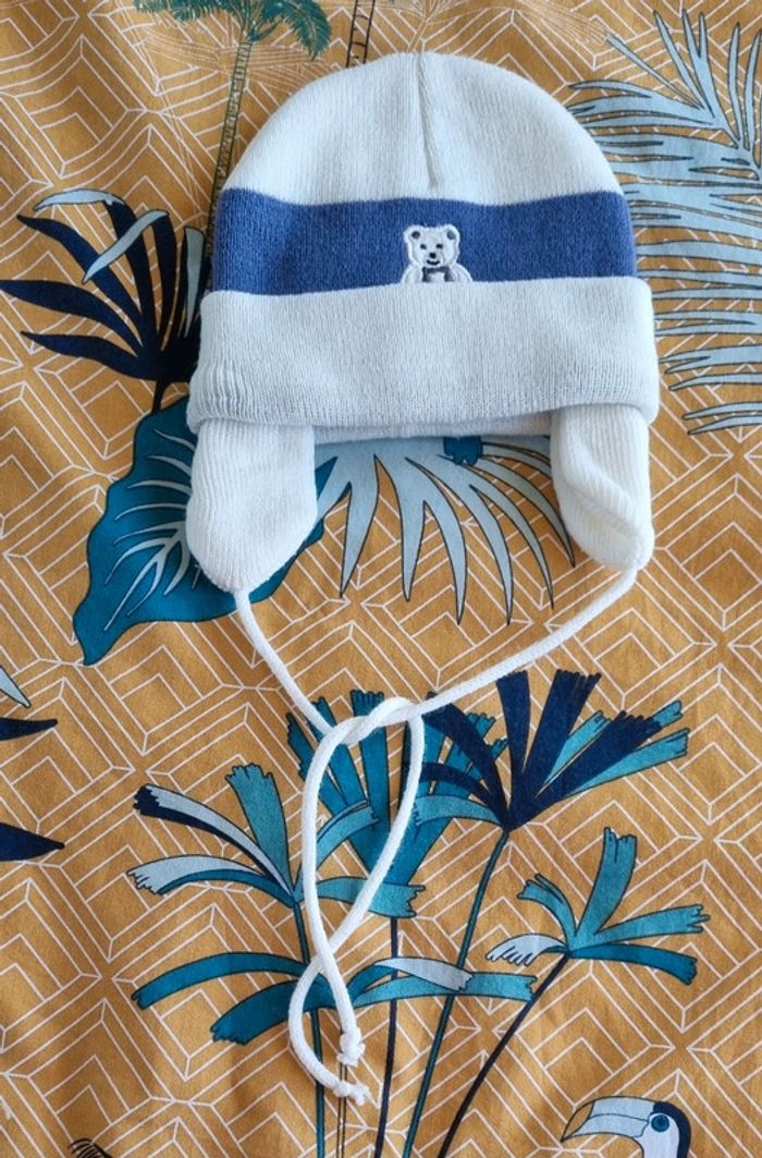 Bonnet cache oreilles garçon Avec écusson ourson cousu à l'avant 100% acrylique Très bon état Porté 1 fois