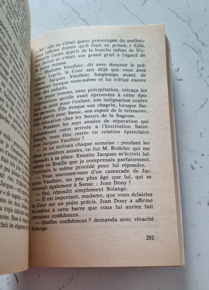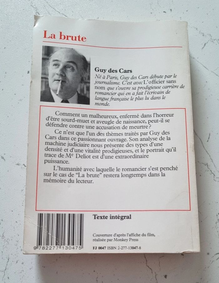 La Brute Le livre a été adapté du film en 1987 314 pages Histoire : Jacques Vauthier est né aveugle et sourd. Grâce à son talent naturel et à son éducation auprès des Frères de Saint-Gabriel, il peut continuer ses études. Avec l'aide de sa femme, il écrit une autobiographie. Par conséquent, il est même connu jusqu'aux États-Unis, où il part en tournée. Au retour, un américain est assassiné sur un bateau de fret. Vauthier est retrouvé près de la victime avec l'arme du crime à la main et enduit de sang. Tout indique qu'il est le coupable. Maître Victor Deliot, un avocat âgé au parcours banal, est désigné pour défendre Vauthier. Cela semble être une tâche impossible et l'accusé ne semble même pas nier les faits. Deliot croit toujours à l'innocence de Vauthier et enquête elle-même.