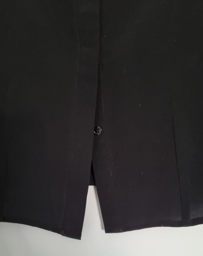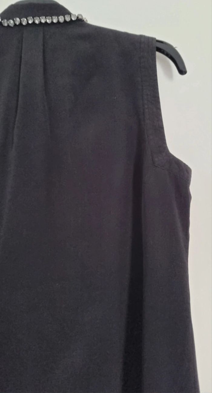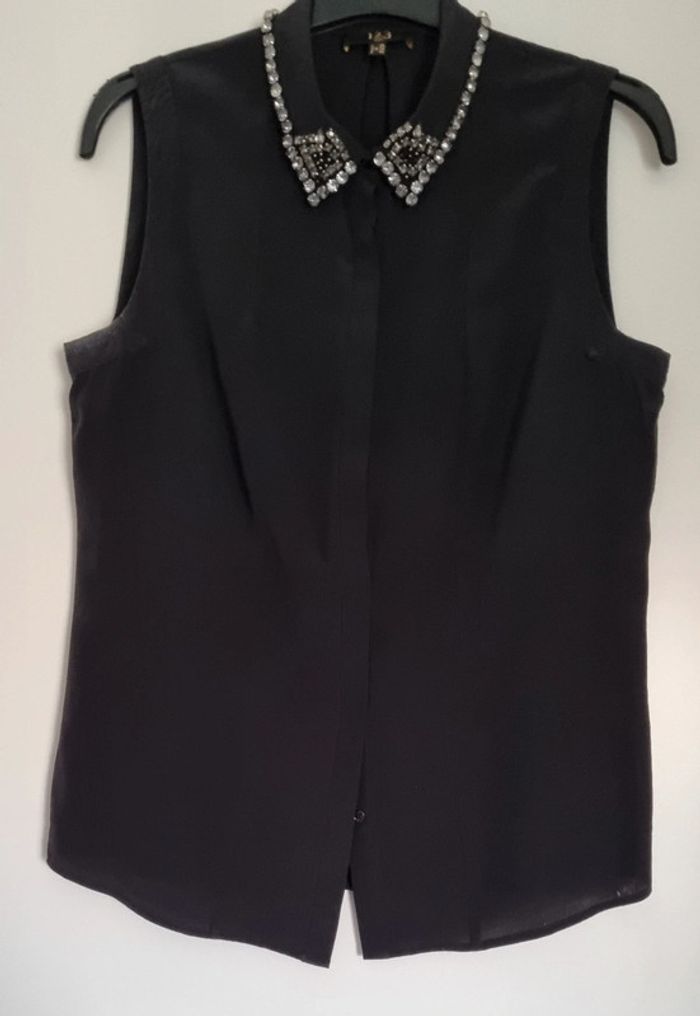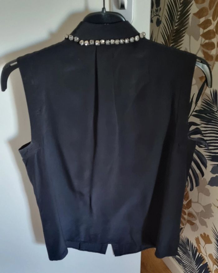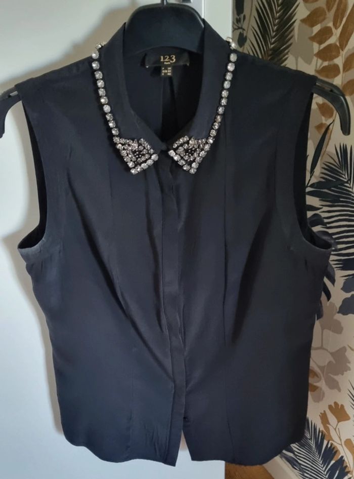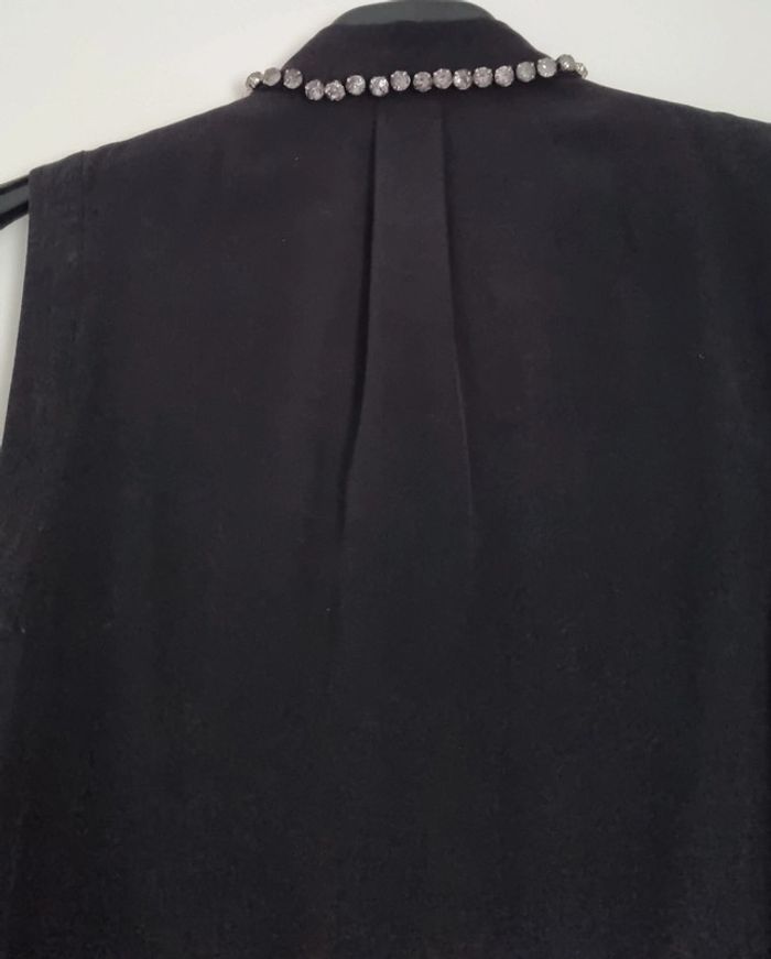 Chemisier noir sans manches Boutonnage avant Col en V avec pierres strass cousues Tailke : 38 Matière : 100% soie