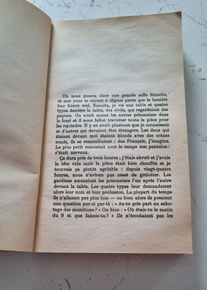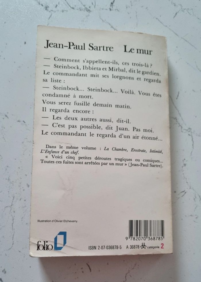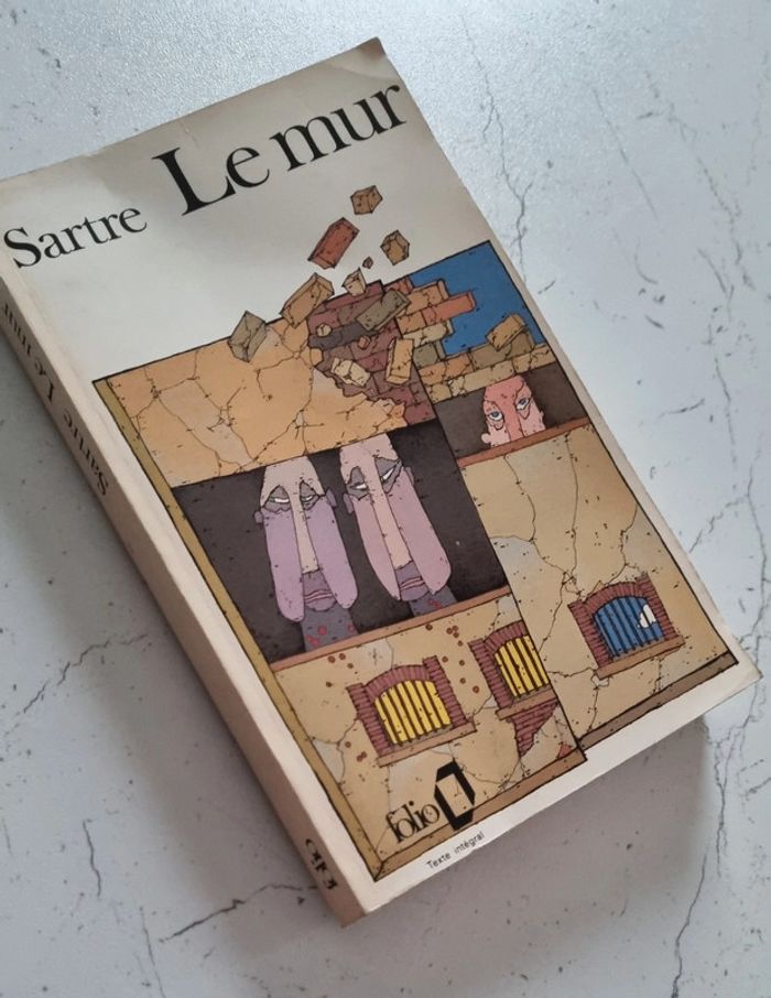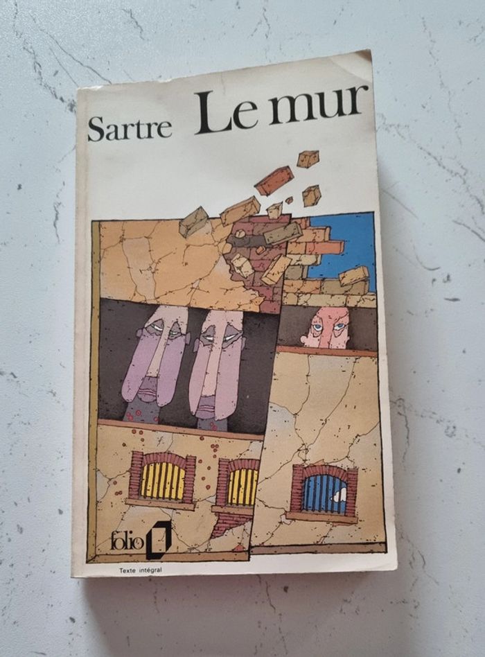 Livre de poche Le Mur de Jean Paul Sartre 252 pages Éditions Gallimard 1939 Le Mur est le récit à la première personne d'un prisonnier républicain espagnol condamné à être fusillé par les armées franquistes ; la nuit d'attente s'achève dans la dérision du sort (survie non désirée grâce à une trahison non voulue).