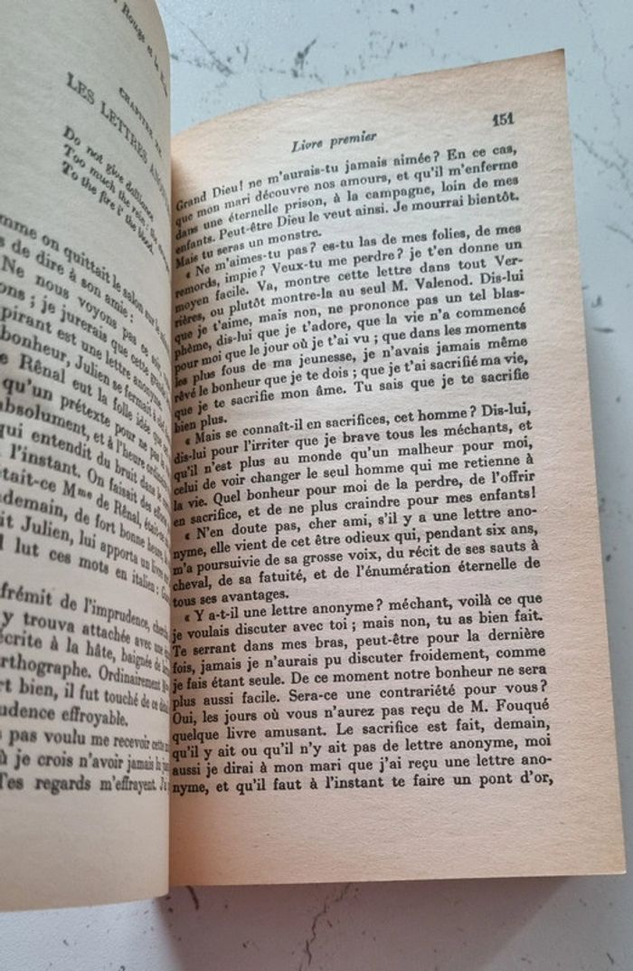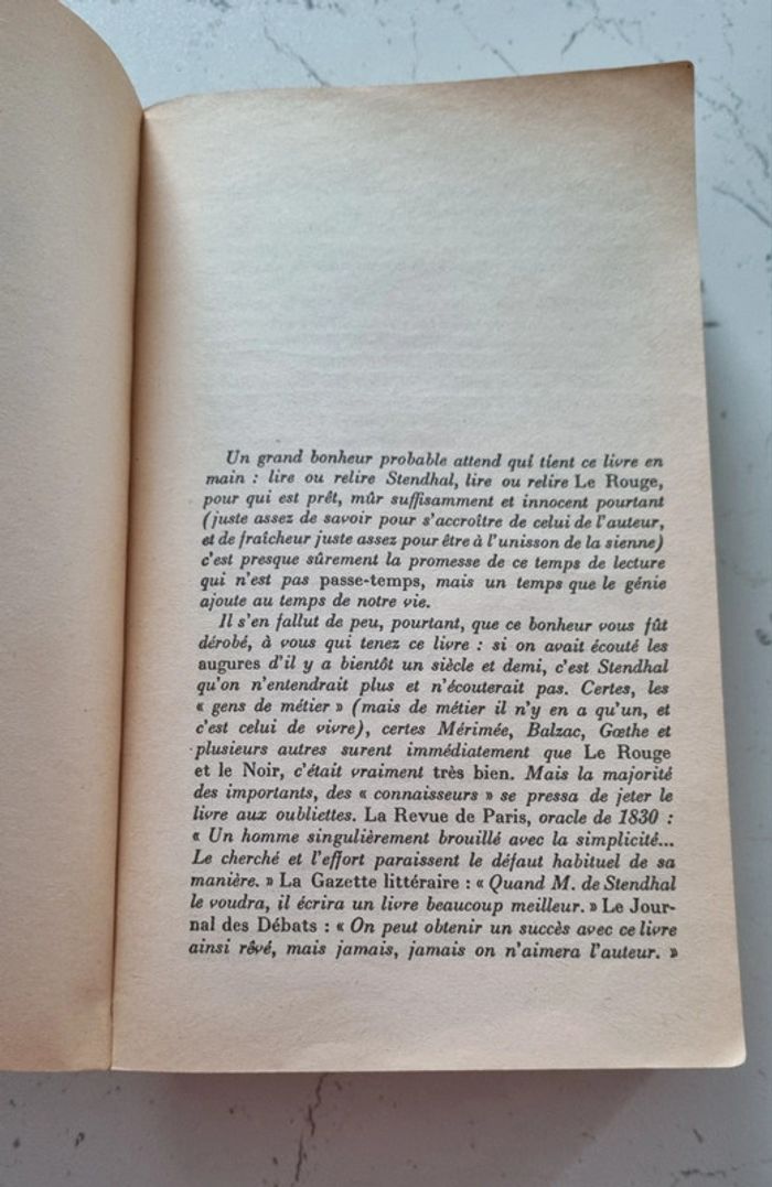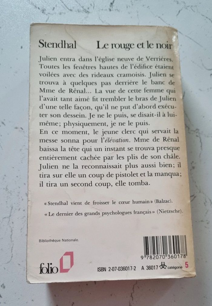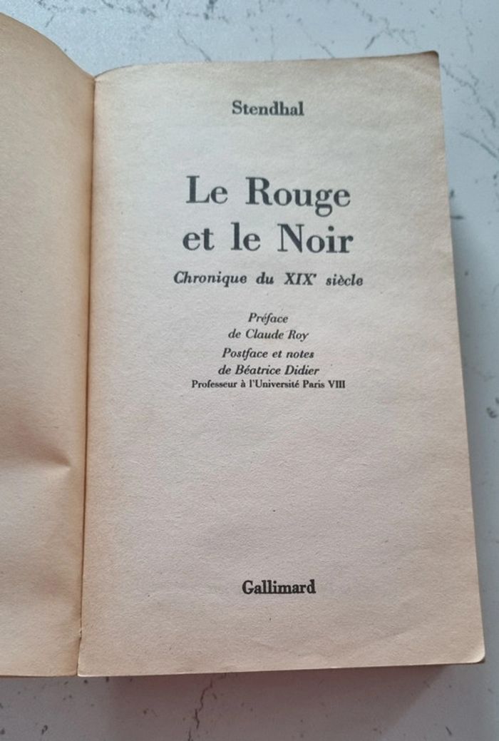 Livre Le Rouge et le Noir de Stendhal 693 pages Livre en très bon état Éditions Gallimard 1972 Histoire : Le Rouge et le Noir, publié en 1830, est un roman de Stendhal. L'histoire se déroule en France au XIXe siècle et met en scène Julien Sorel, un jeune homme ambitieux issu d'un milieu modeste, qui tente de s'élever dans la société en usant de son intelligence et de son charme. Entre passion amoureuse et calculs politiques, Julien devra faire face à de nombreux obstacles. Ce roman explore les thèmes de l'ambition, de la passion et de la lutte des classes.