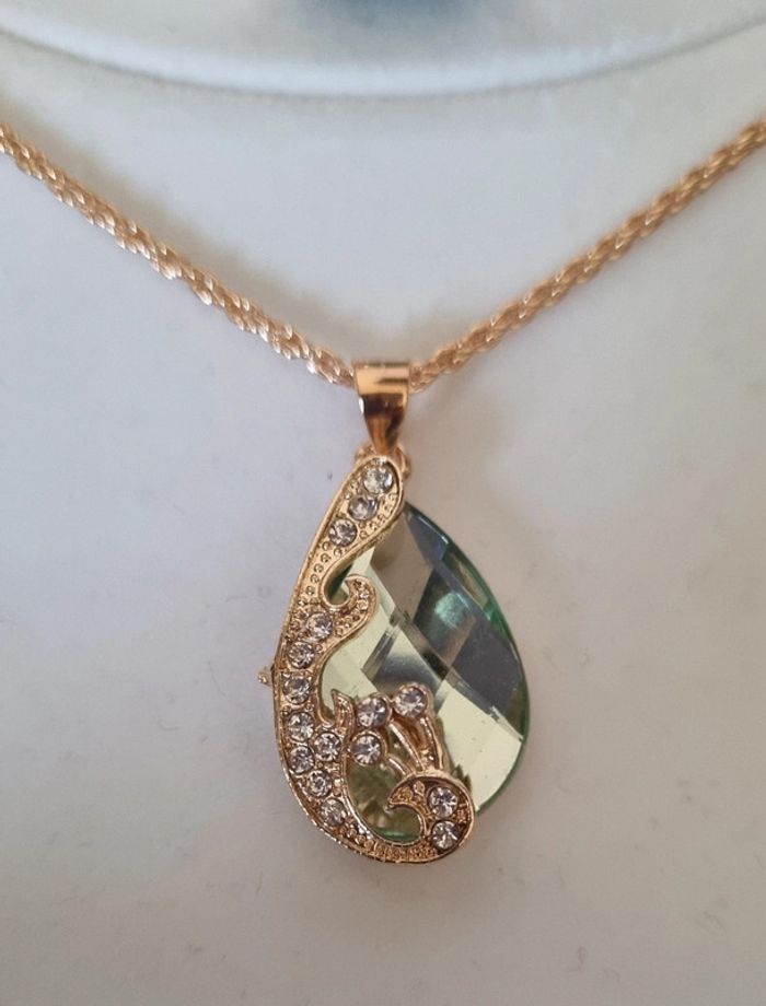 Parure bijoux fantaisie vert jade et doré avec montre vert jade, Cadran rond Bracelet fantaisie Avec petites pierres blanches zirconium Composé d'un collier pendentif, 1 paire de boucle d'oreilles et 1 bague ajustable Longueur de la chaîne : 40 cm Livrée dans une pochette organza Parure neuve, jamais portée