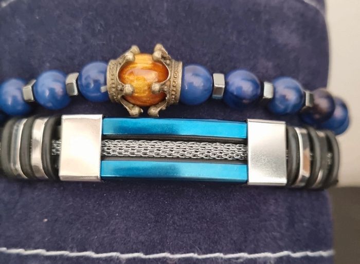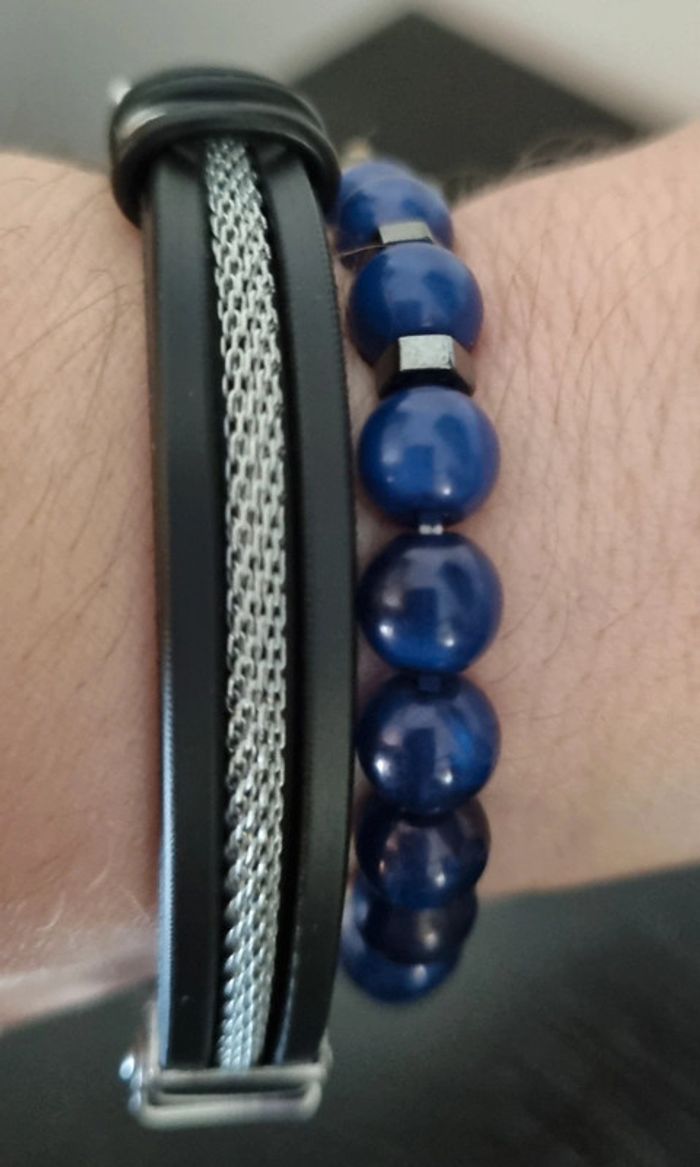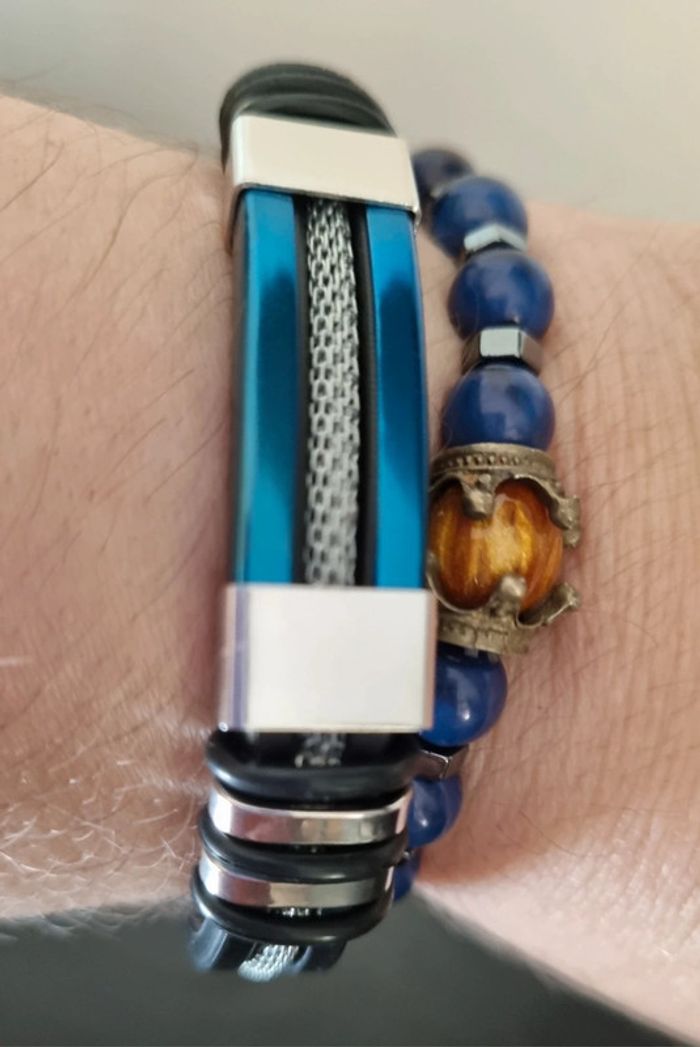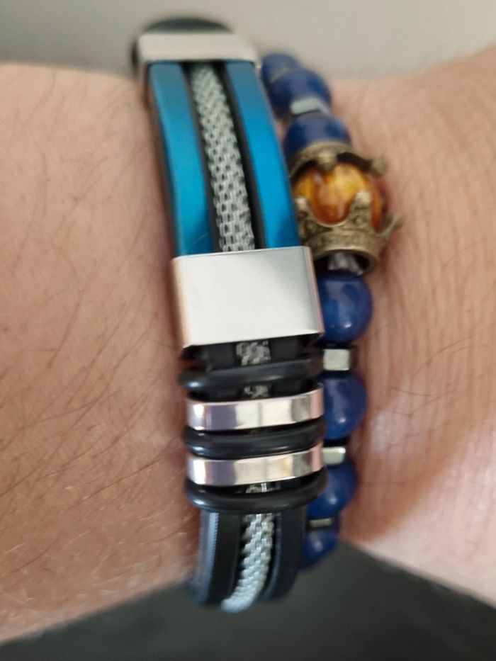 Ensemble montre et 2 bracelets fantaisie Coloris bleu azur Comprend: -1 Montre quartz ronde avec aiguille pour homme, bracelet fantaisie en polyuréthane - 2 bracelets ( 1 en perles et 1 en métal) Longueur bracelets metal: 22 cm Neufs, jamais portés Vendus sans boîte