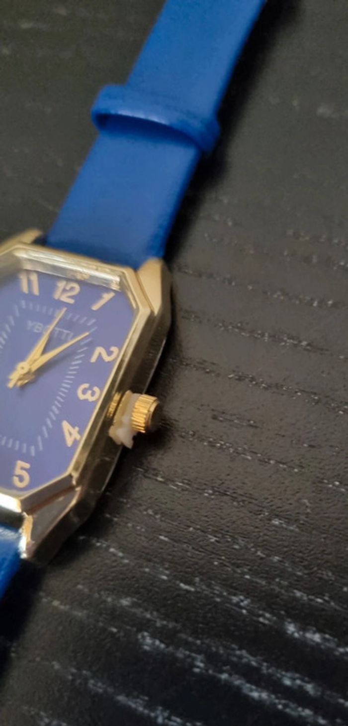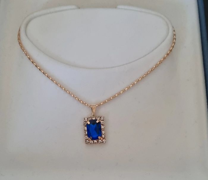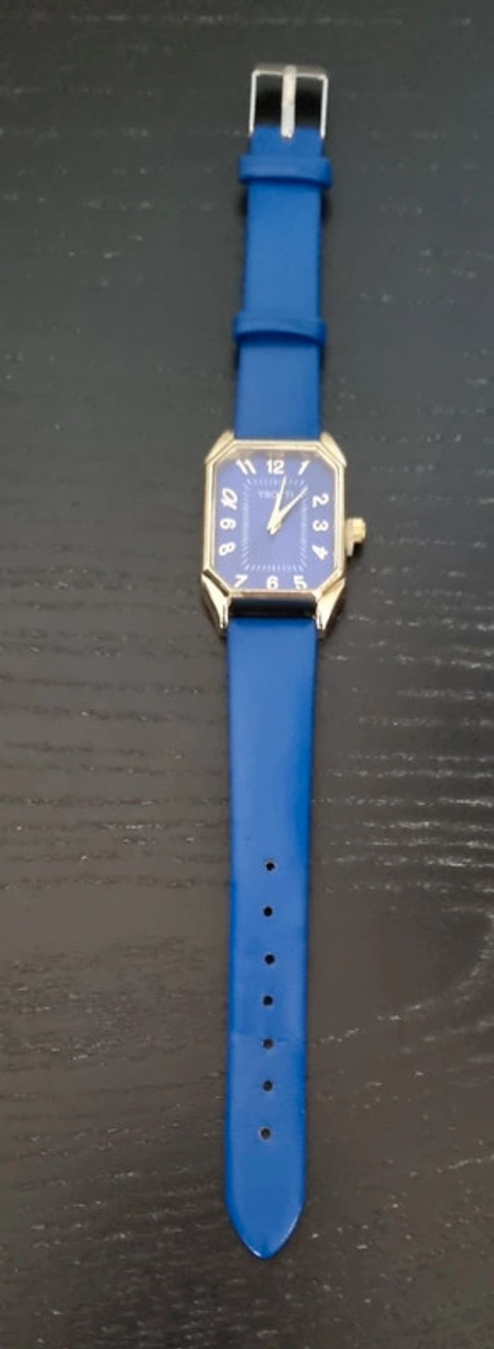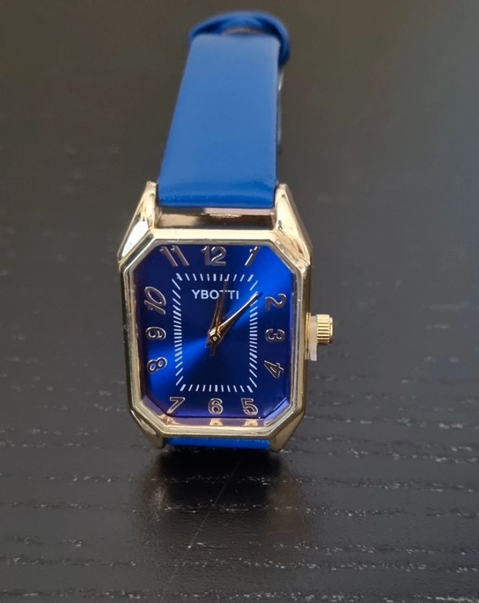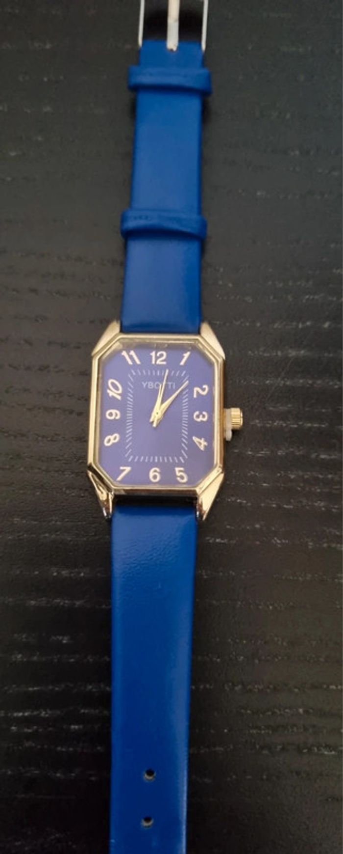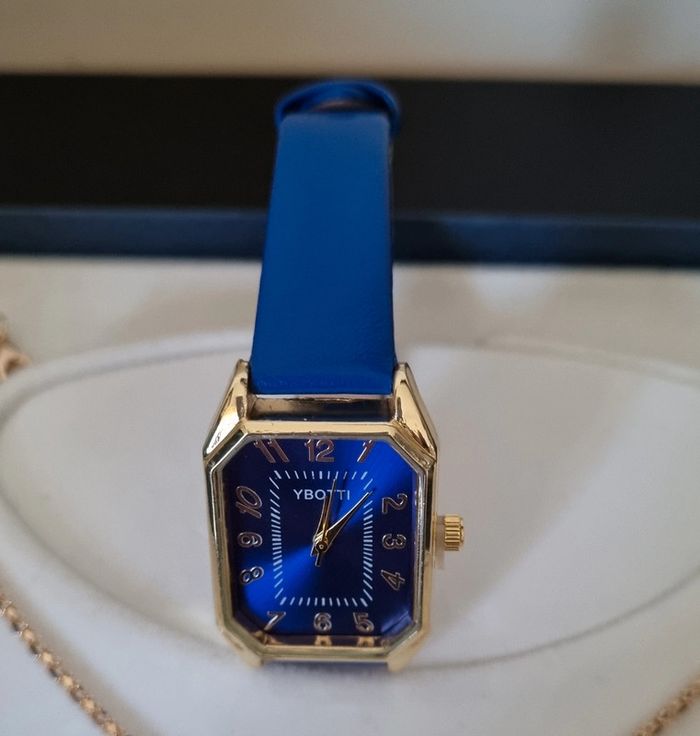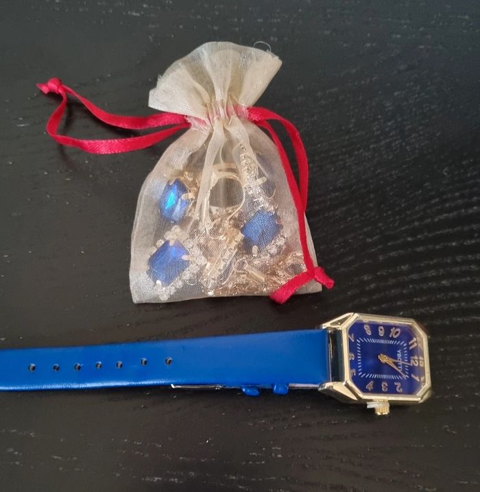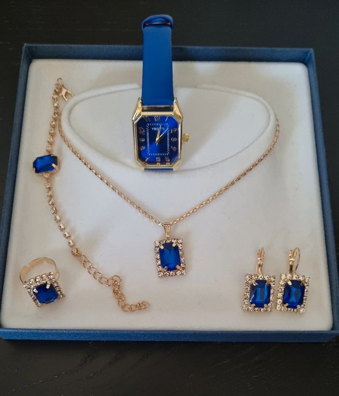 Parure bijoux fantaisie bleu et doré avec montre bleu, Cadran rectangulaire Bracelet fantaisie Avec petites pierres blanches zirconium Composé d'un collier pendentif bleu, 1 paire de boucles d'oreilles dormeuses et 1 bague ajustable Longueur de la chaîne : 40 cm Livrée dans une pochette organza Parure neuve, jamais portée