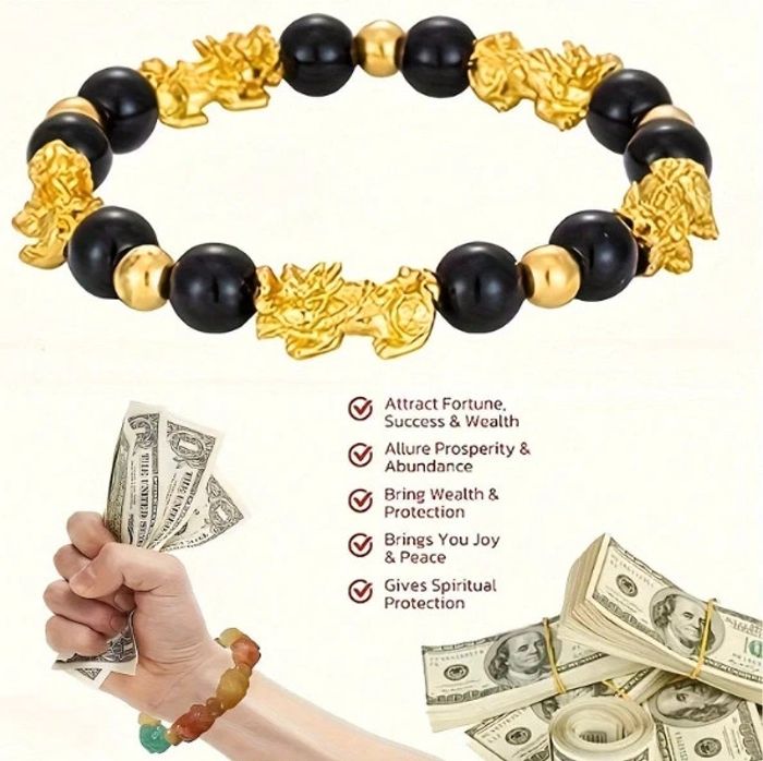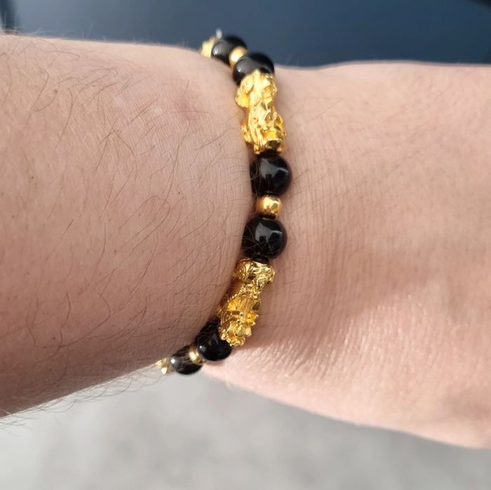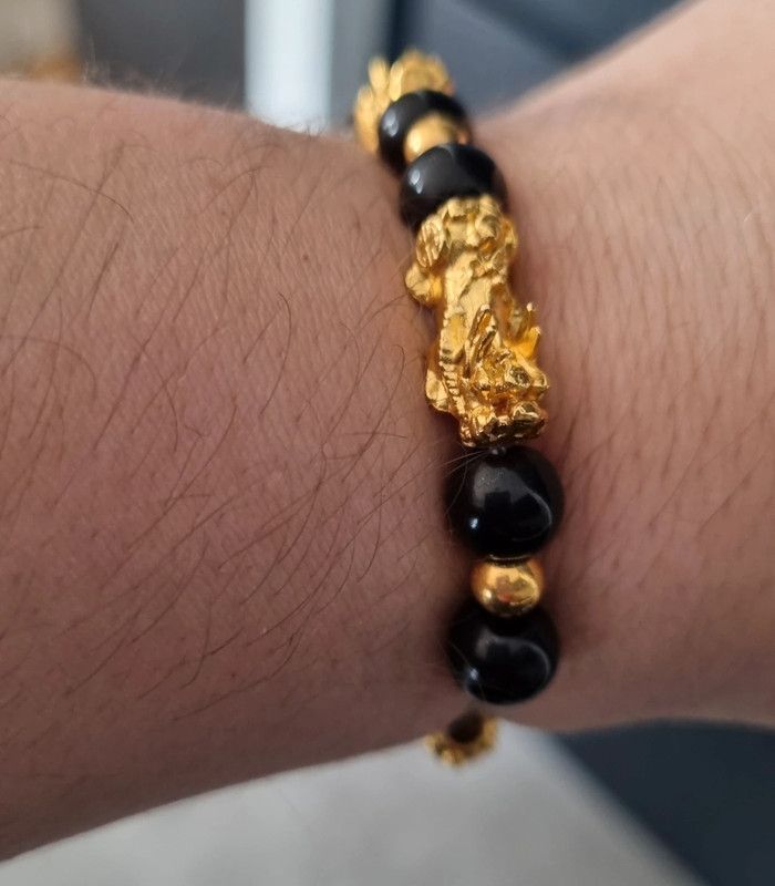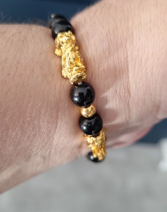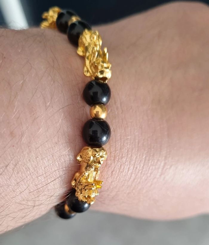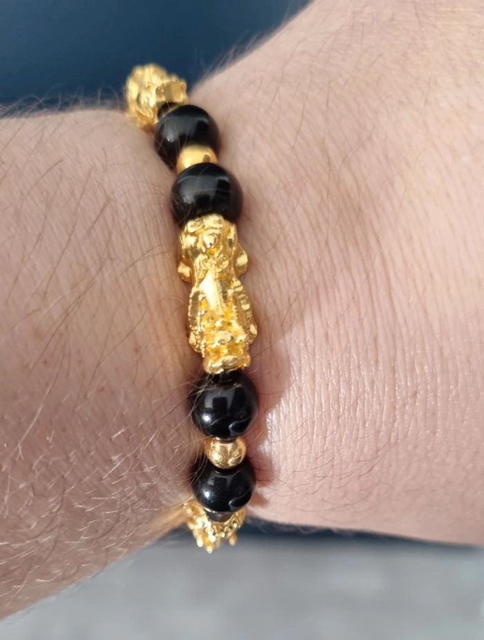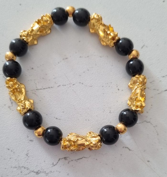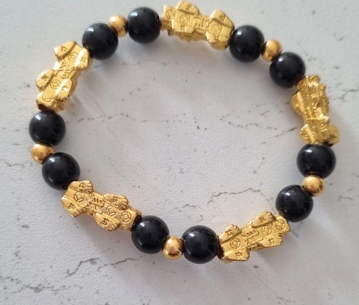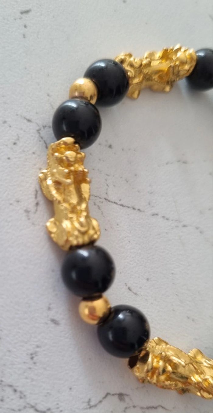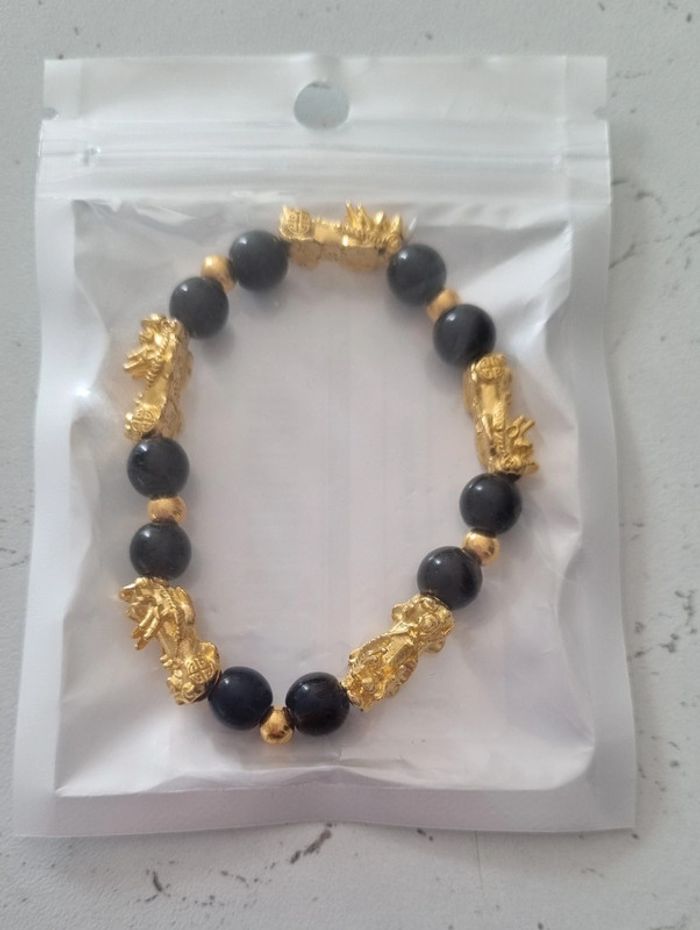 Bracelet perles noires et dorées Porte bonheur Feng Shui Avec tête de pixiu Pour attirer la chance et la richesse Neuf