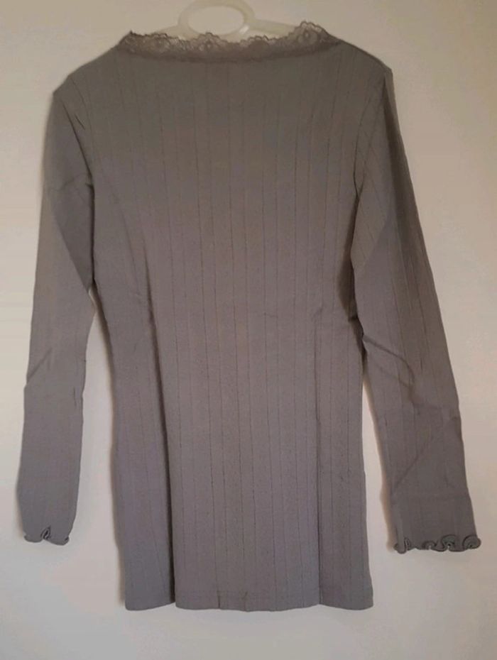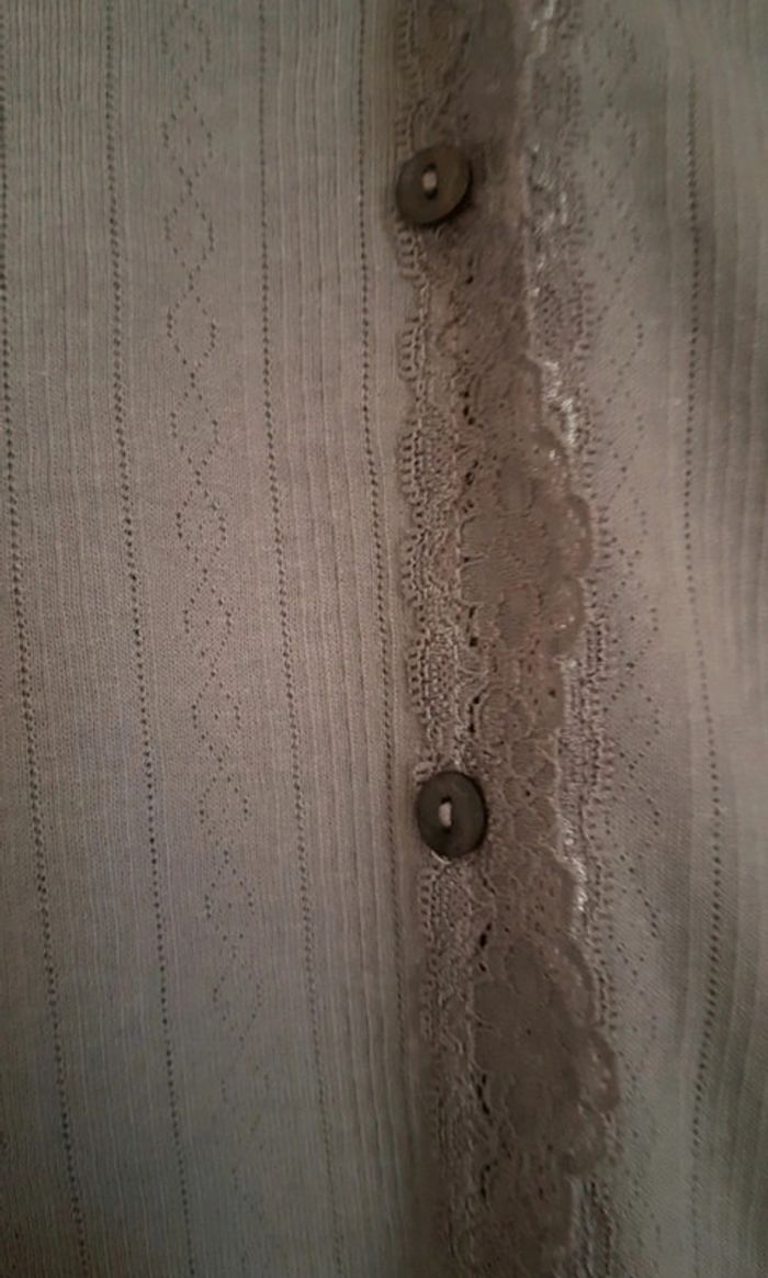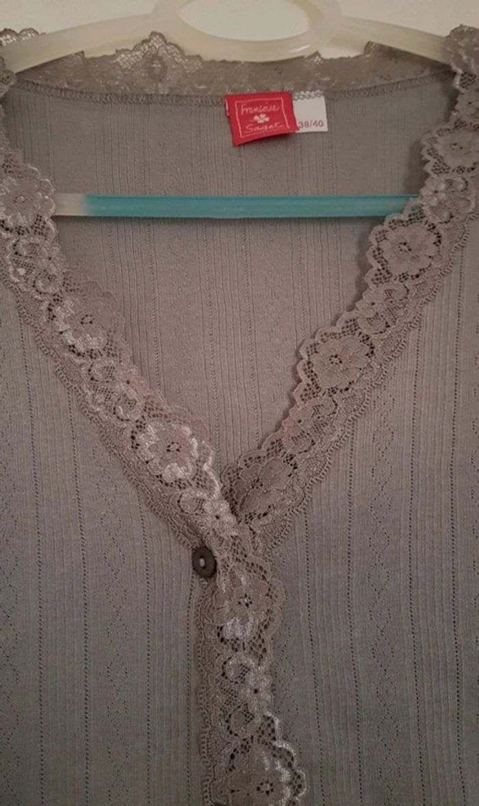 Gilet de nuit gris en V dentelle avec boutons manches longues à coordonner avec le pyjama corsaire blanc et gris 100% coton Taille 38/40 Dimensions aisselle à aisselle : 39 cm Longueur : 70 cm