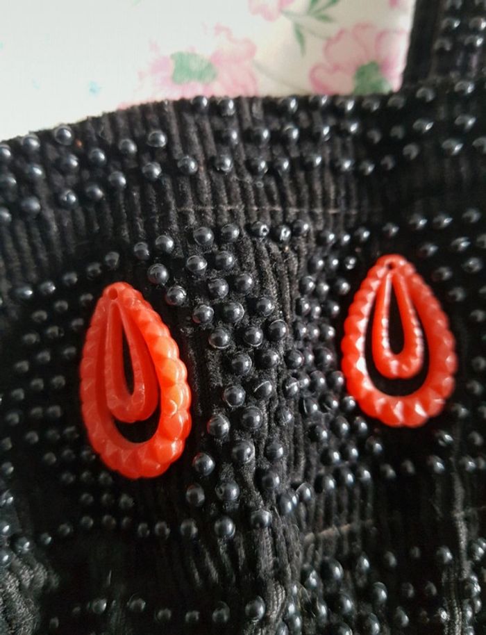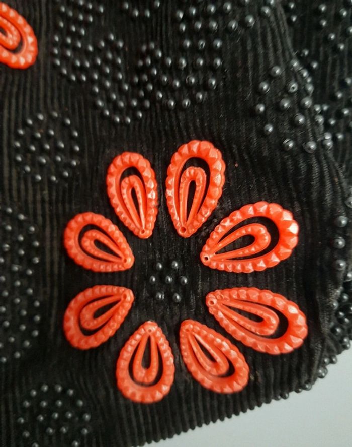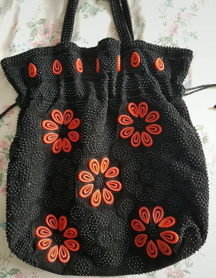 Sac à main noir à fleurs orange, perles d'acier et rosace orange en plastique, cordons de serrage sur les côtés, anses en perles d'acier Intérieur noir en polyamide