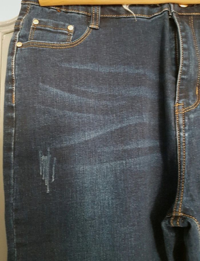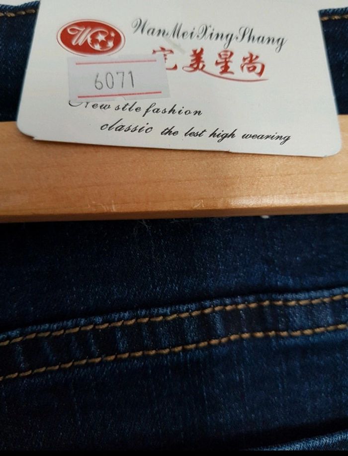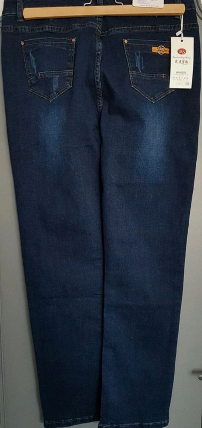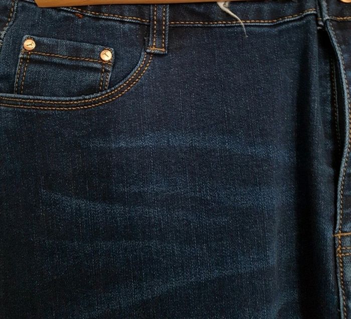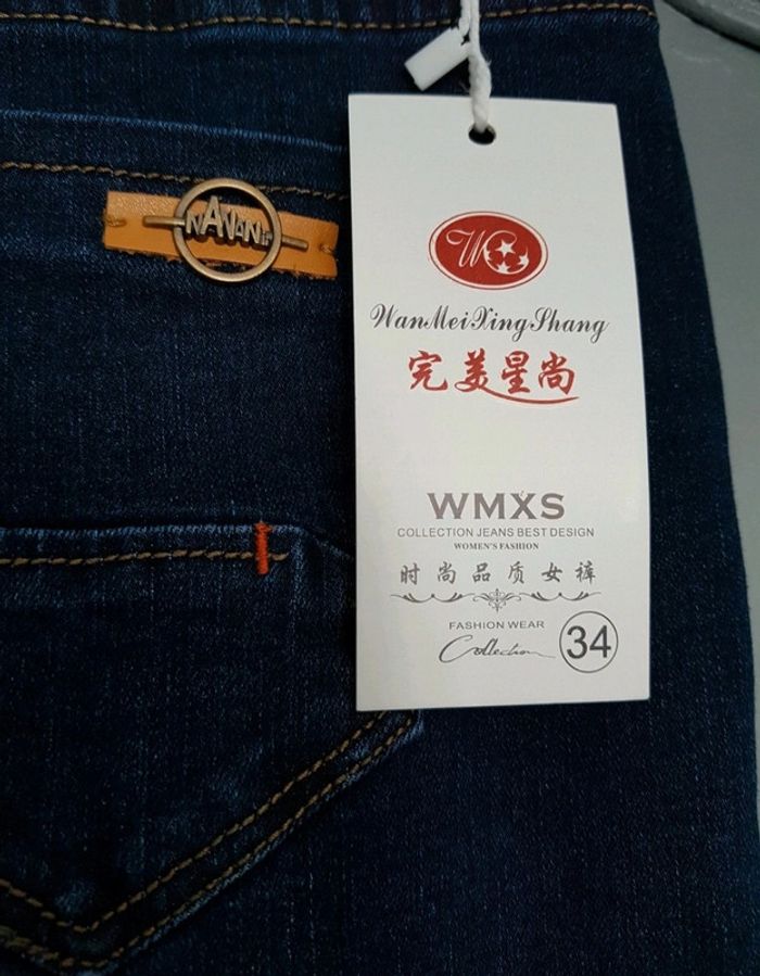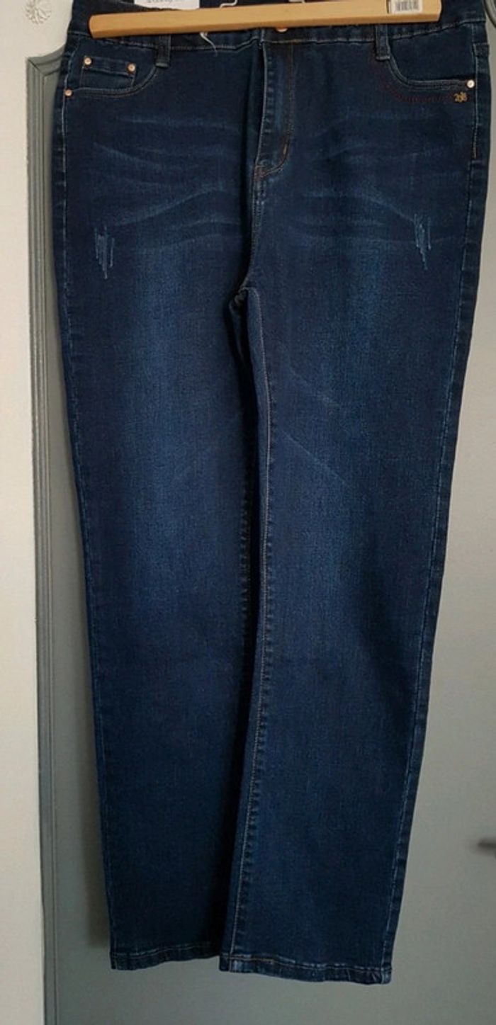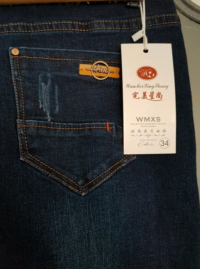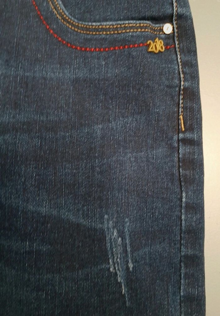 Pantalon jean femme bleu avec fermeture éclair, coupe droite, griffé devant et sur les poches avant et arrière et surpiqûre rouge sur la poche gauche Matière en polyester et élasthanne