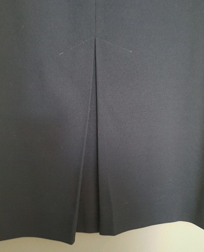 Jupe longue bleu marine, fermeture par bouton au dos Bonsoir Taille : 38 à la base mais reprise en 36 cm à la taille Longueur : 85,5 cm Fente à l'arrière de la jupe 60% acétate et 40% viscose Portée 3 ou 4 fois