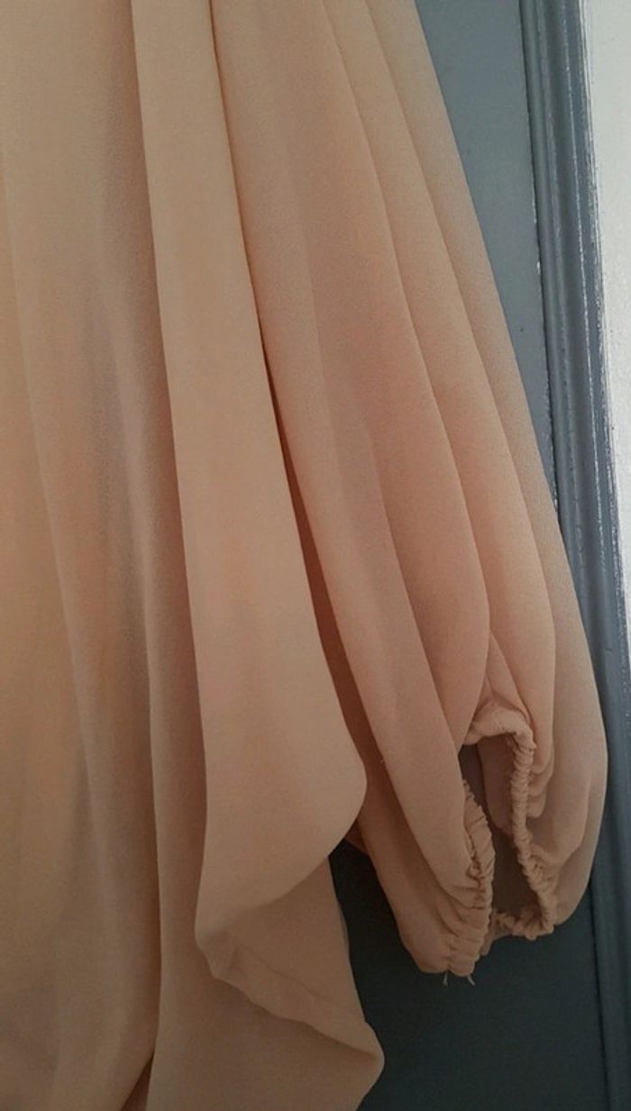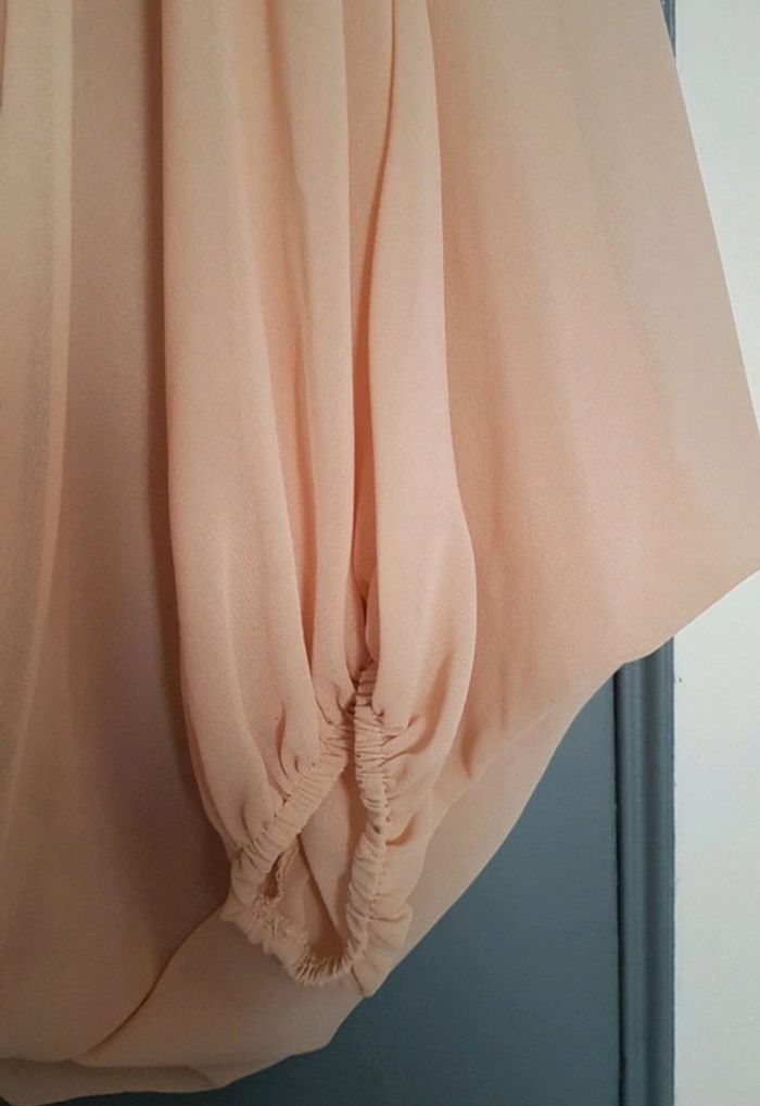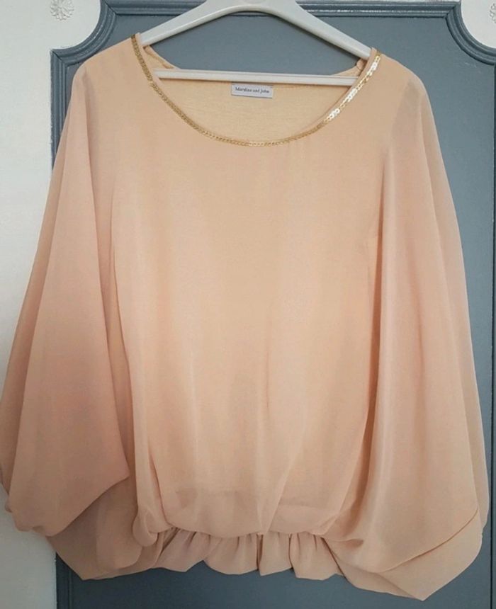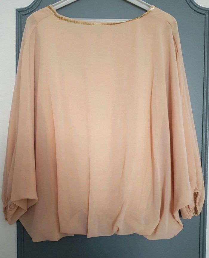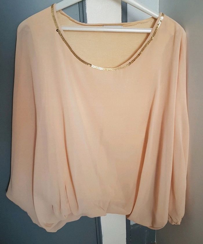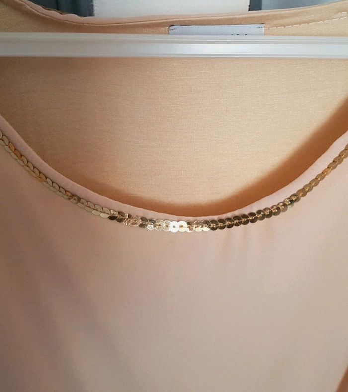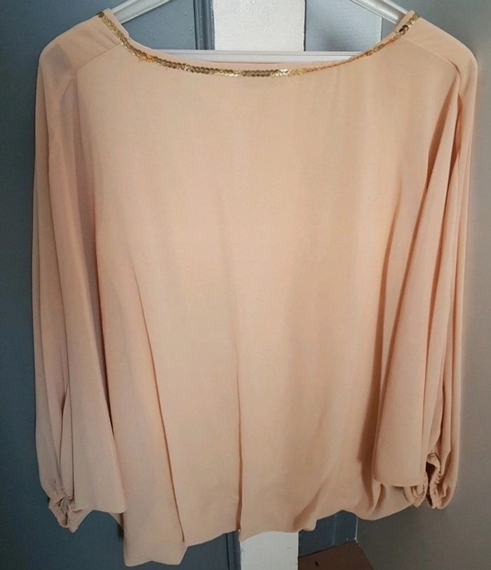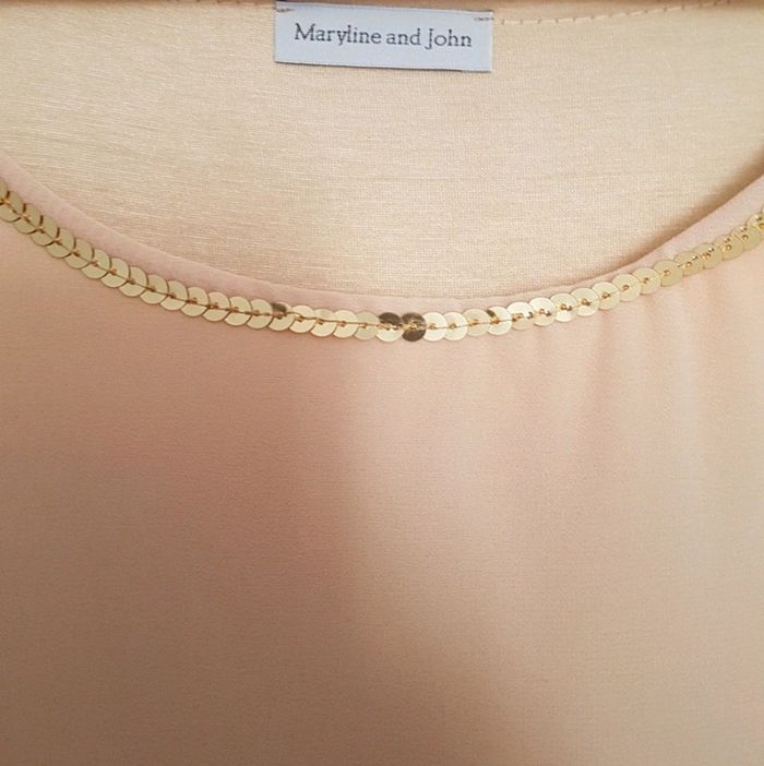 Blouse beige manches longues avec sequins dorés cousus sur tout le col rond, élastique à la taille et aux poignets, avec doublure 100% polyester