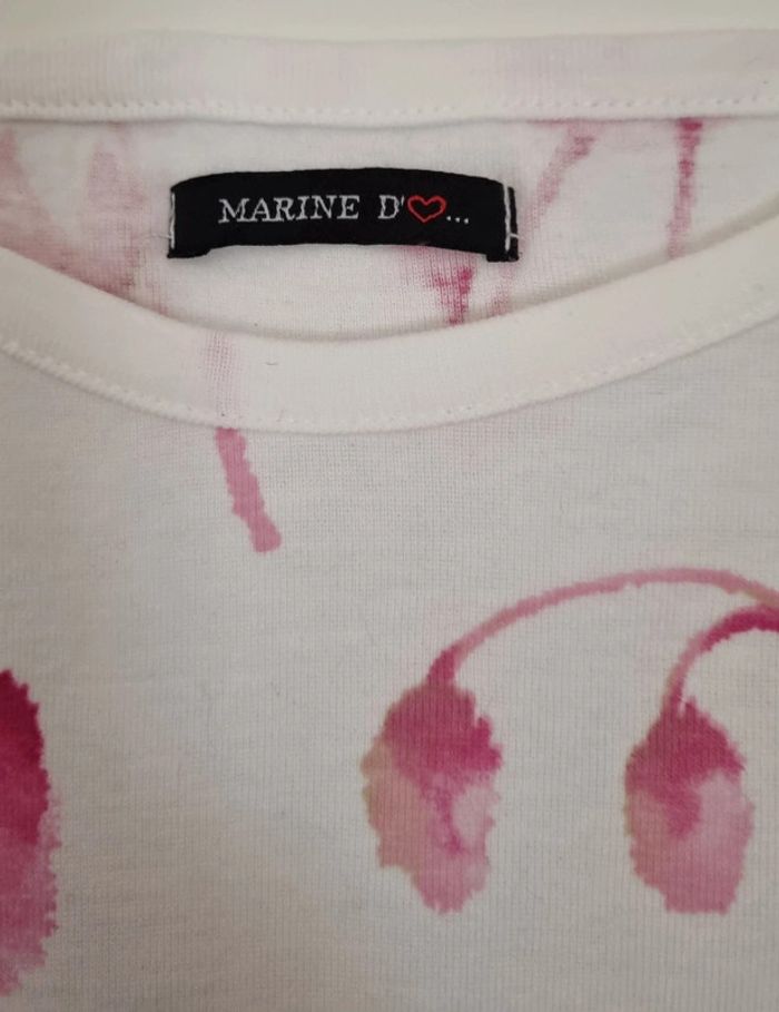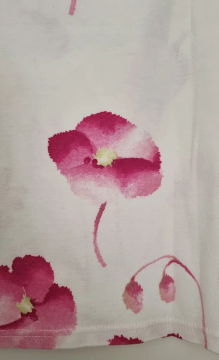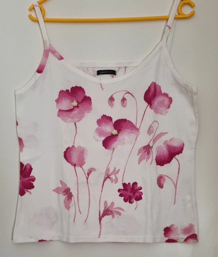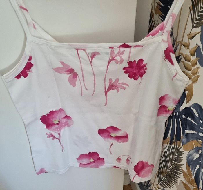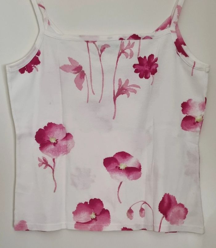 Top à bretelles blanc et fleurs roses 100% coton Taille 7( 46/48) Longueur 58 cm D'aisselle à aisselle : 49 cm