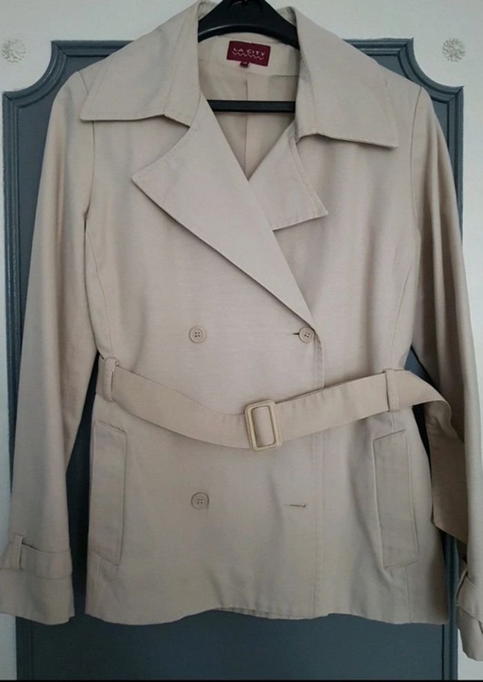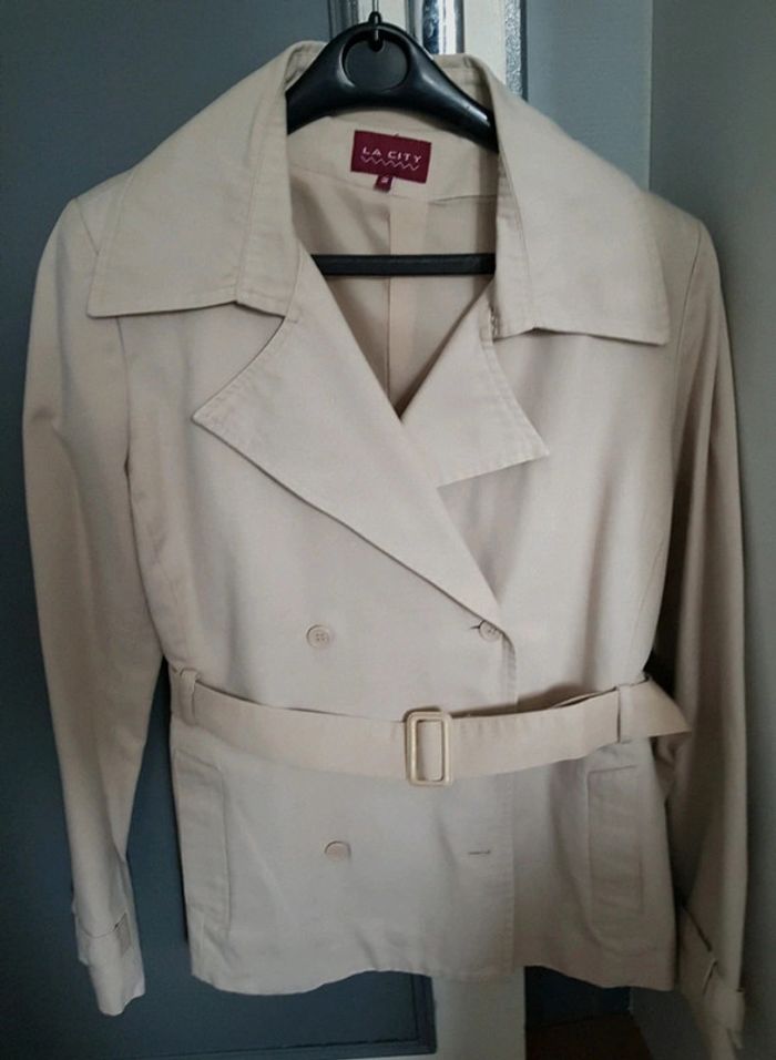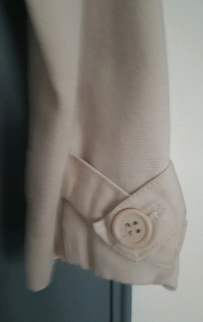 Veste courte femme écru avec ceinture Avec 2 poches et double boutonnage 100% coton avec doublure Veste nettoyée au pressing Portée 5 /6 fois Taille 2 (38/40)