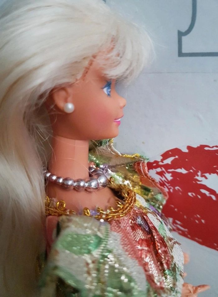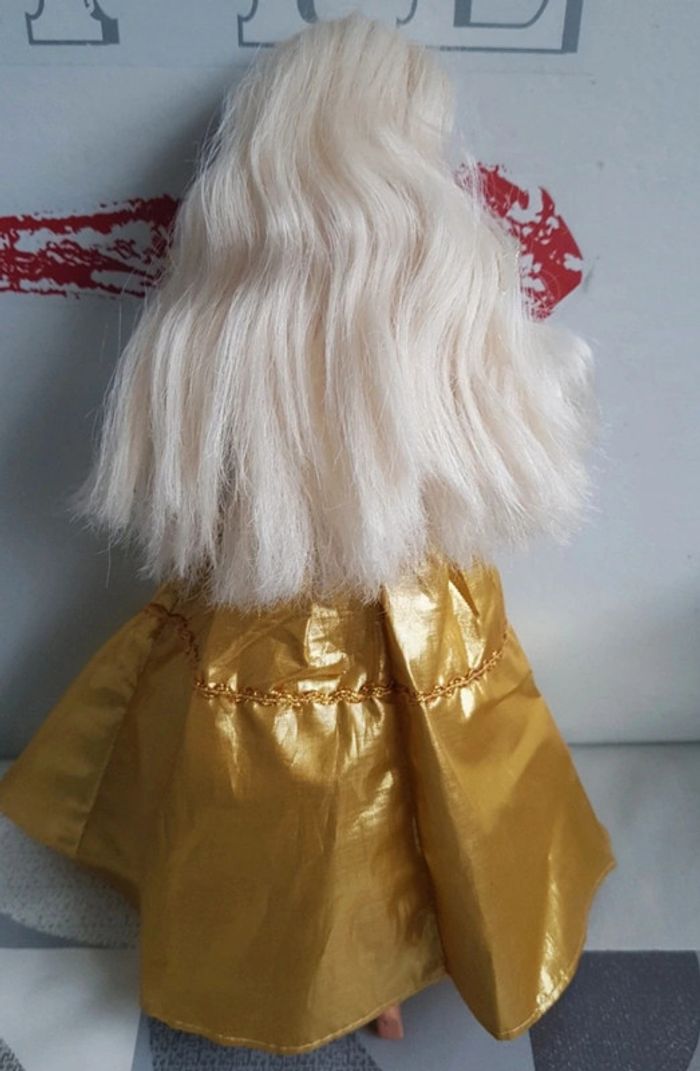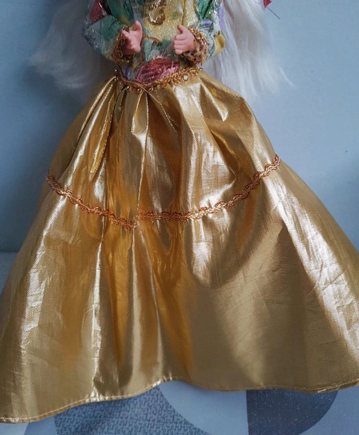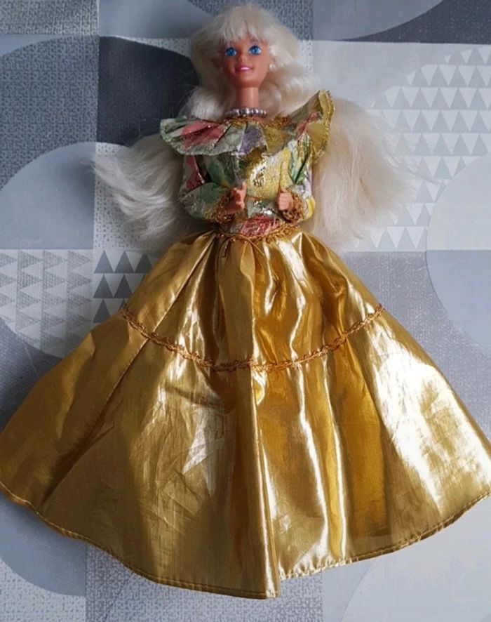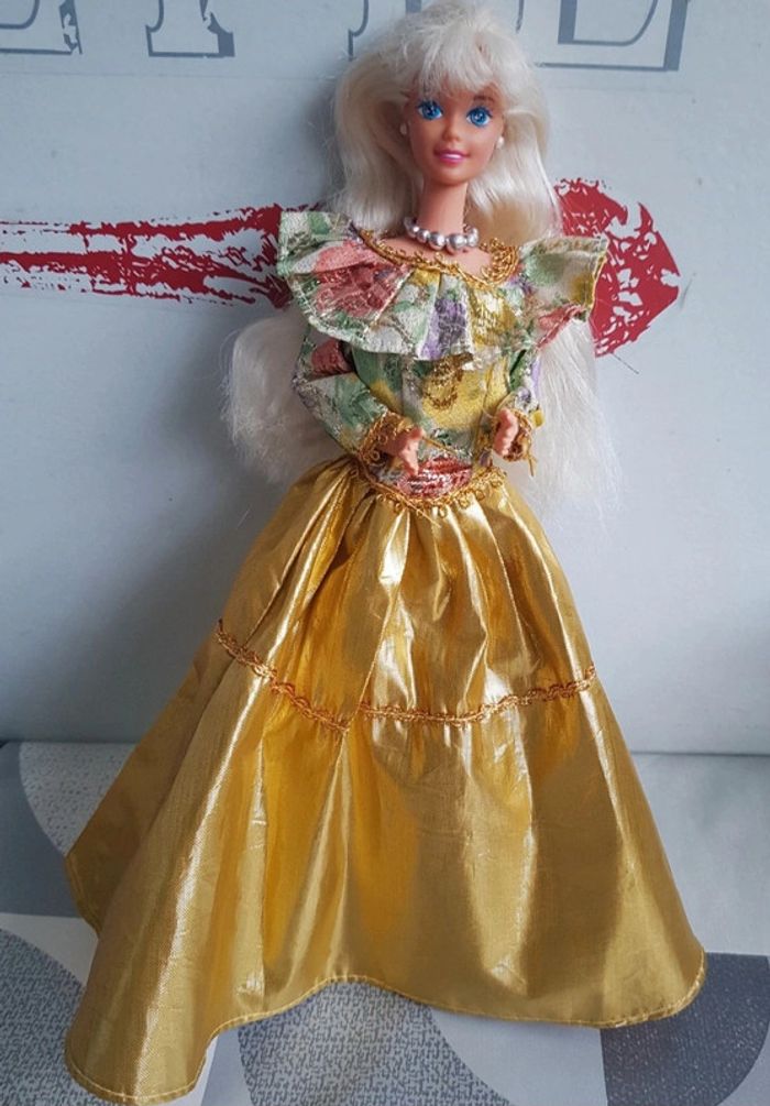 Barbie blonde cheveux longs avec robe de princesse dorée et collier perles Vendue sans chaussures ni sous vêtements Comme neuve La main droite est abîmée (mordue par ma fille )