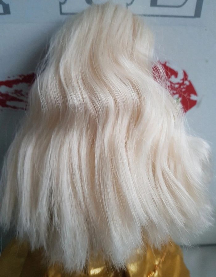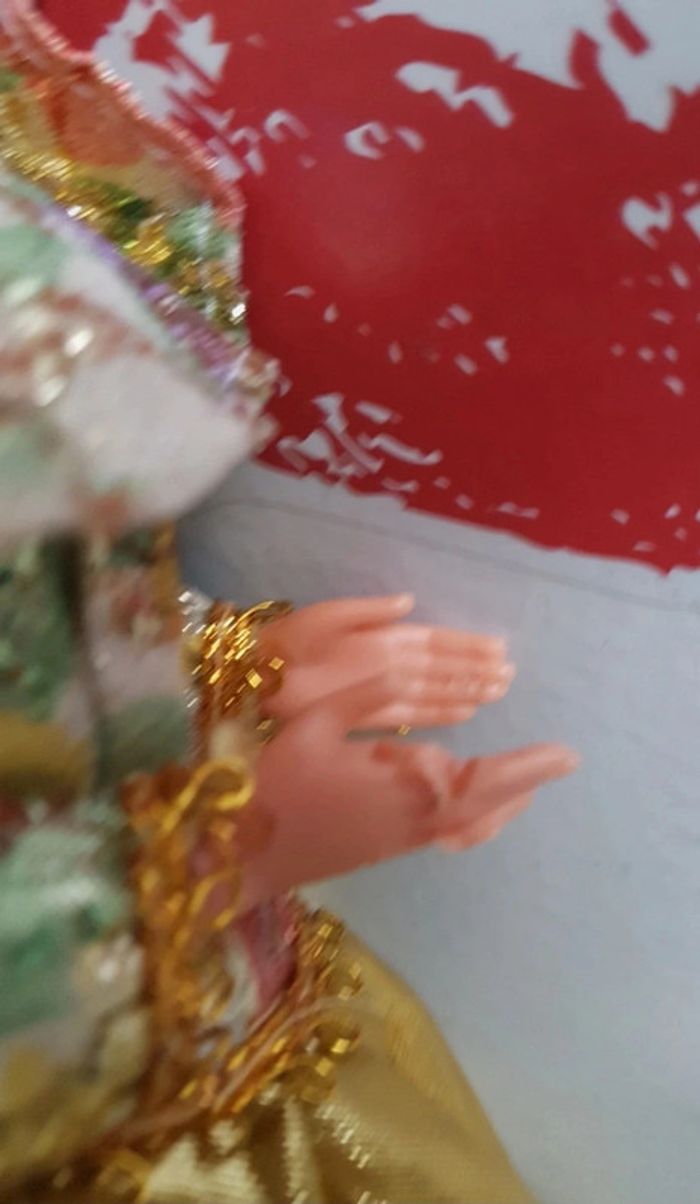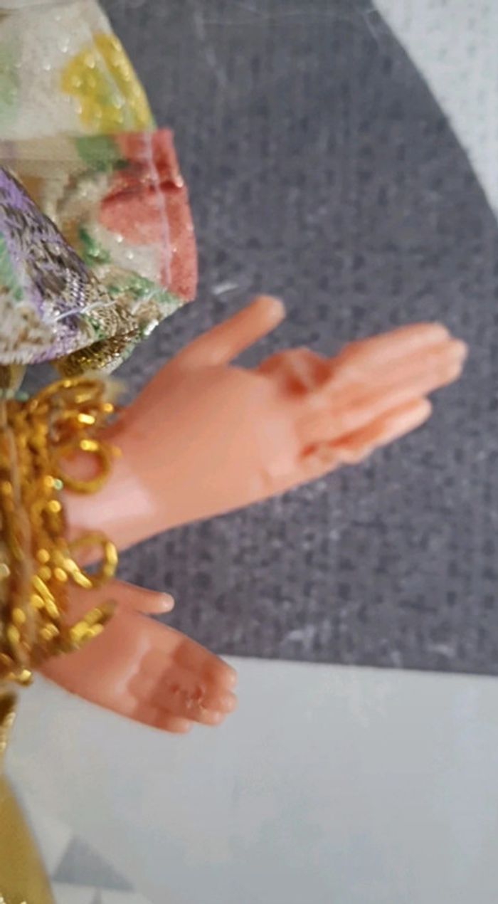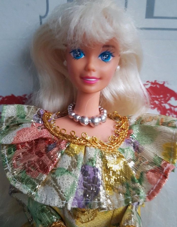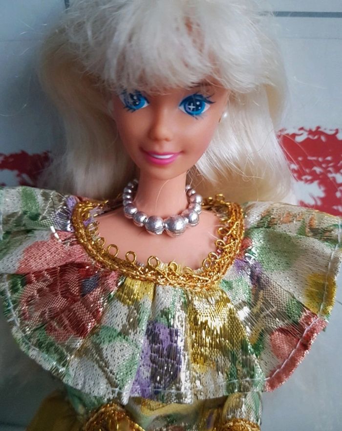 Barbie blonde cheveux longs avec robe de princesse dorée et collier perles Vendue sans chaussures ni sous vêtements Comme neuve La main droite est abîmée (mordue par ma fille )