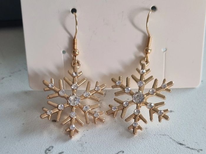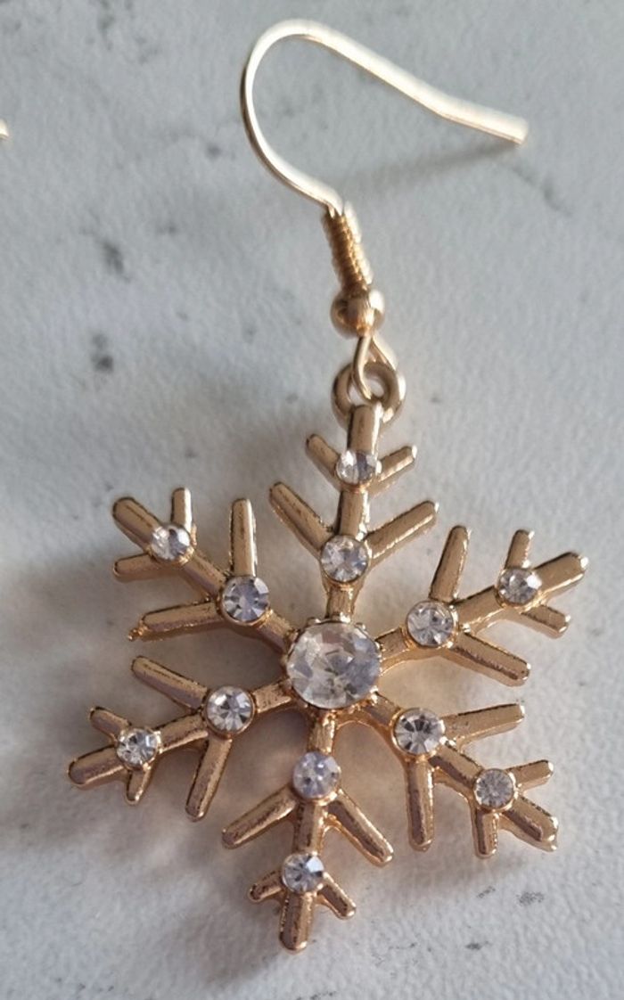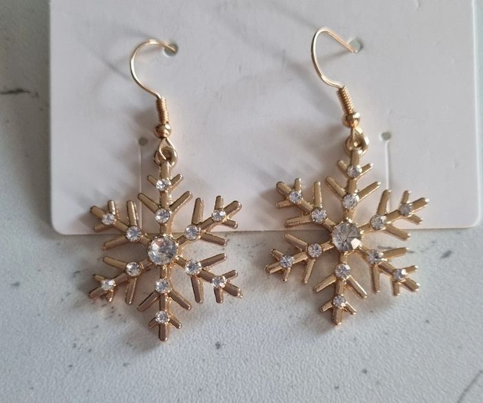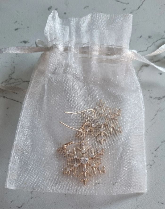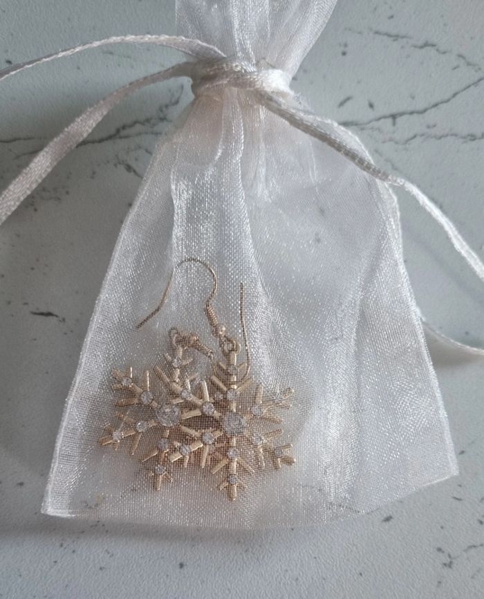 Paire de boucles d'oreilles Flocons En métal doré et pierres imitation zirconium Dimensions du flocon: 2,5X2,5 cm Neuf dans leur pochette organza
