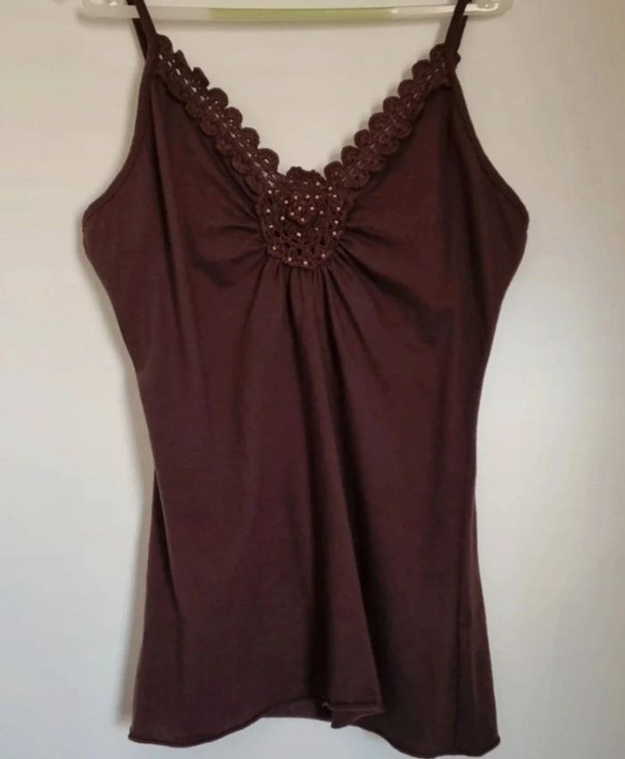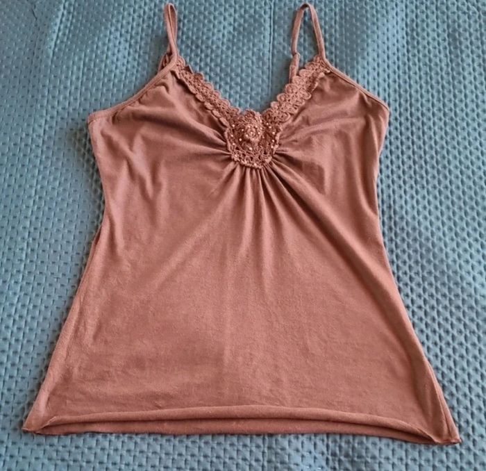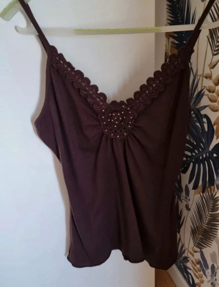 Top marron à bretelles et rosace en crochet Longueur : 64 cm Aisselle à Aisselle : 53 cm Peu porté 65% polyester et 35% coton Taille 38/40