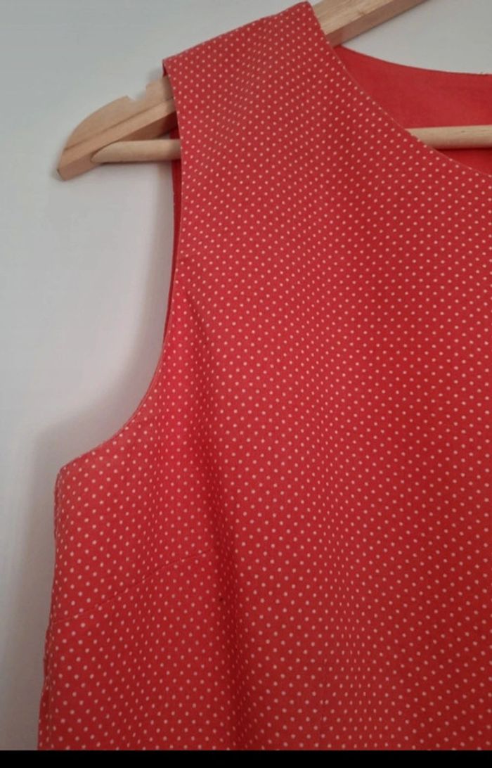Débardeur corail à pois blancs Bouton d'attache au dos Coupe près du corps 100% coton Avec doublure en coton Avec fermeture éclair sous l'aisselle gauche Dimension d'aisselle à aisselle : 46 cm