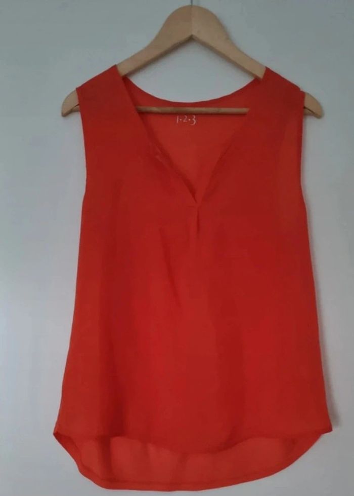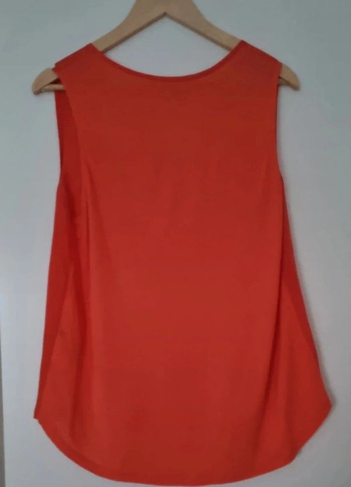 Débardeur sans manches orange corail bi matière Col V Devant en viscose et derrière en elasthanne Peu porté