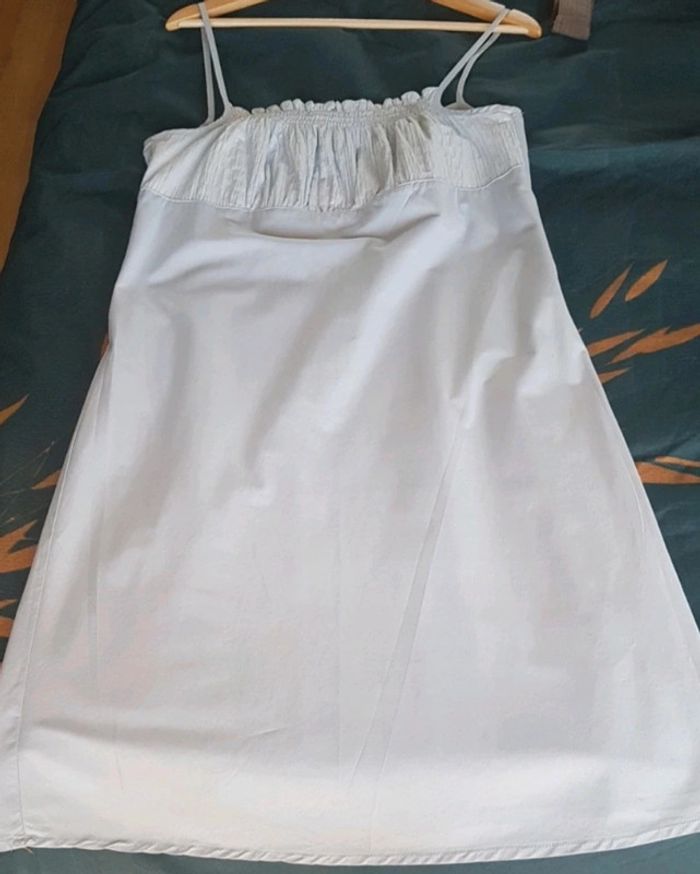 Robe d'été à bretelles bleu ciel Robe avec doublure Sur l'étiquette indiquée taille 44 mais taille plutôt 42 72% coton, 27 polyamide et et 1% elasthanne Portée 4/5 fois Longueur de la bretelle jusqu'en bas : 98 cm
