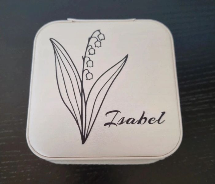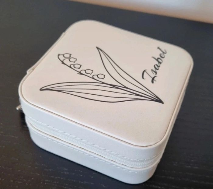 Coffret à bijoux crème avec fermeture éclair et inscription prénom Isabel à emporter dans tous les déplacements Dimensions : 10X10 cm Avec compartiment pour bagues, bracelets, boucles d'oreilles .